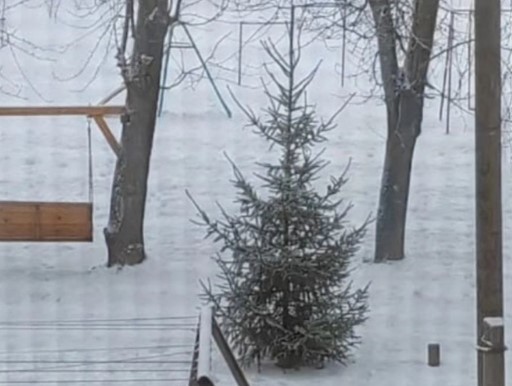 Эта ель появилась во дворе одного из домов. На фото – маленькое дерево без гирлянды и игрушек. Впрочем, украсить ёлку можно. Есть вероятность, что это планируют сделать. Правда, в таком случае непонятно, почему её не украсили сразу.