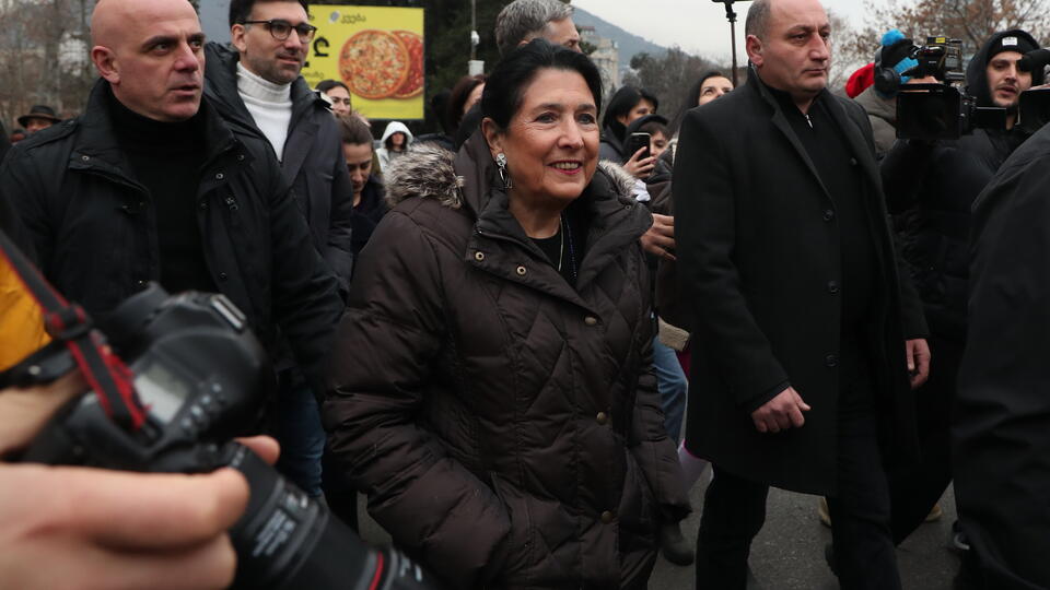 В окружении телохранителей и сохраняя молчание, пока еще действующий президент Грузии Саломе Зурабишвили после выхода к протестующим спешно возвращается в президентский дворец. Времени нет даже на короткое интервью.