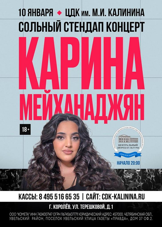 Карина Мейханаджян – комик, резидент шоу «Женский стендап» на ТНТ, ведущая подкаста «Ну мам» на канале LABELSMART. Карина известна своим умением мастерски использовать самоиронию и сарказм, что делает её выступления не только смешными, но и остроумными. Её способность остро и тонко шутить о самой себе, окружающих, а также рефлексировать на темы самооценки, межличностных отношений и повседневной жизни, обеспечивает зрителю не только волну смеха, но и моменты для размышления о жизни, отношениях и самопознании. Билеты уже в продаже, не пропусти!»