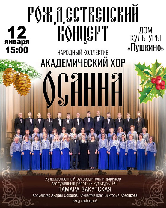 Дом культуры «Пушкино» приглашает на традиционный Рождественский концерт Народного коллектива Академического хора «Осанна» под управлением Заслуженного работника культуры РФ Тамары Викторовны Закутской. Вашему вниманию любимые народные, классические и духовные произведения.