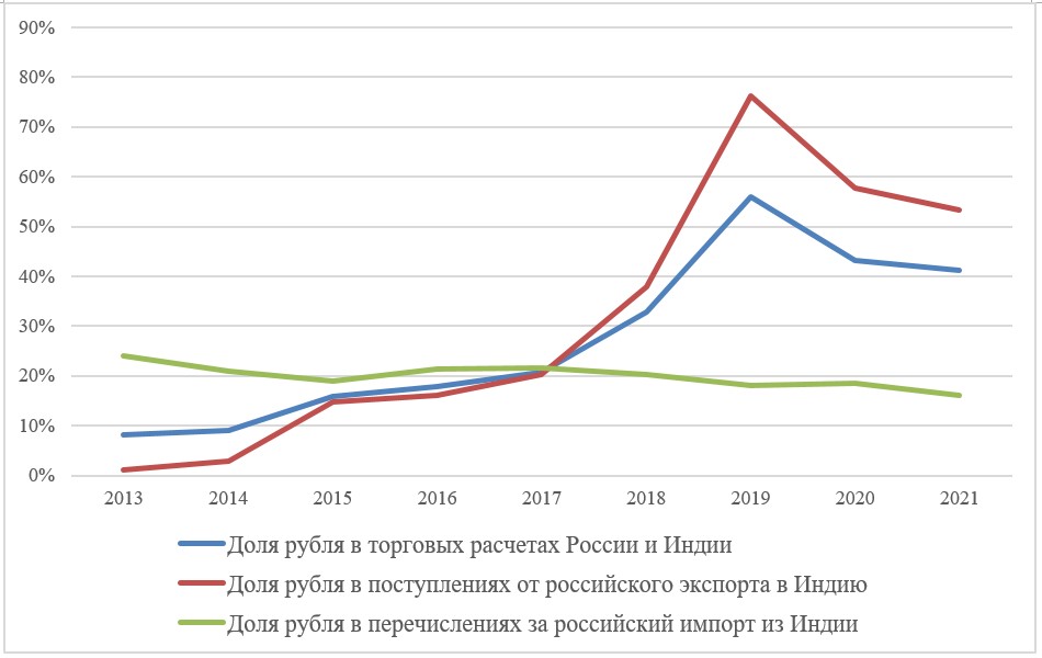 Хотя некоторые индийские аналитики отмечают, что Индия оплачивала часть российских товаров рупиями с 2019 г., это суждение не соответствует действительности. Во-первых, статистика Банка России не подтверждает такие данные. Во-вторых, до 2022 г. не существовало полноценного механизма получения оплаты в рупиях российскими компаниями. В-третьих, расчеты в рупиях не отвечали интересам обеих стран в обозначенный период. Дедолларизация в России предполагала в первую очередь отказ от доллара в пользу рубля и евро. В то же время в Индии идея интернационализации рупии еще не приобрела всеобщую поддержку, и страна была заинтересована в получении оплаты за свои товары в твердых валютах.