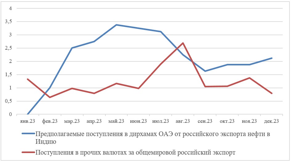 Рис. 2. Поступления в дирхамах за российский экспорт, 2023, млрд долл. США