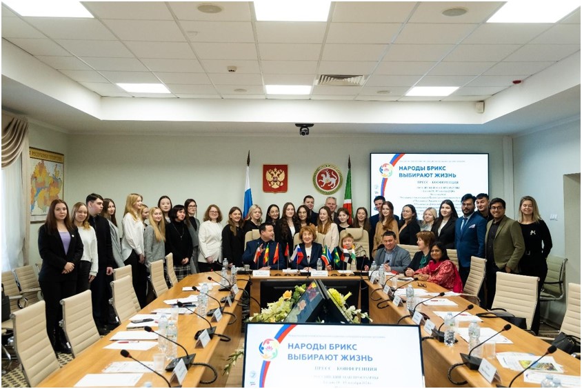 Казанский этап Программы «Народы БРИКС выбирают жизнь» стартовал на пресс-конференции в Общественной палате Республики Татарстан с участием Председателя палаты Зили Рахимьяновны Валеевой, Первого проректора Казанского инновационного университета им. В.Г. Тимирясова Игоря Бикеева, Первого заместителя Председателя правления Союза «ТПП «Республика Татарстан» Артура Николаева, советника ректора КИУ Олега Агапова, членов российского-индийской делегации - соорганизаторов образовательных и деловых мероприятий в Казани.