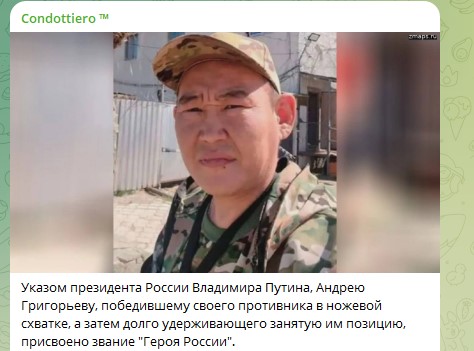 Напомним, сегодня указом президента России Владимира Путина Андрею Григорьеву, победившему своего противника в ножевой схватке, а затем долго удерживающему занятую им позицию, присвоено звание Героя России.