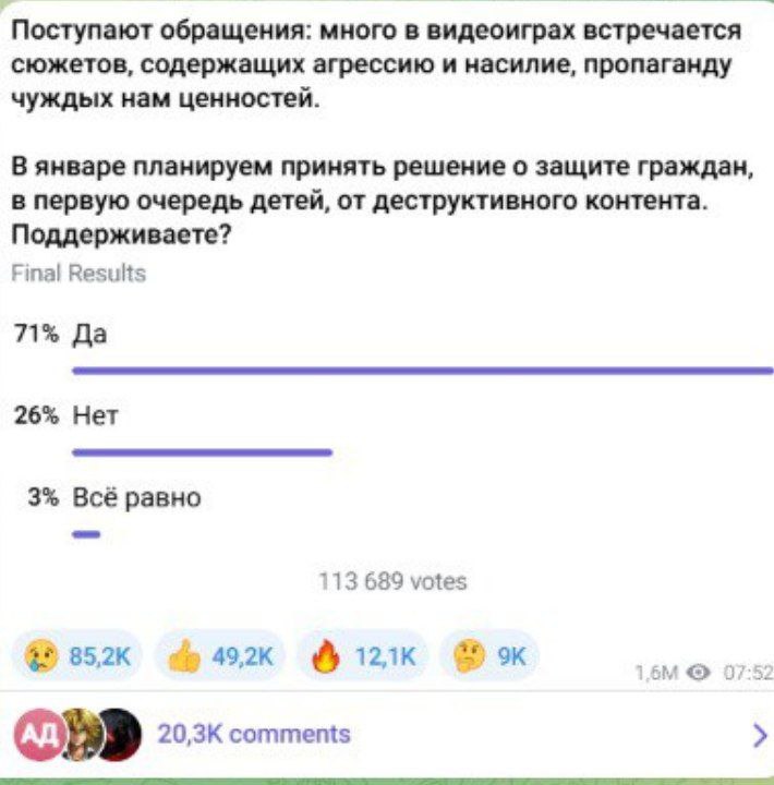 Ряд медиаресурсов заявил о возможном полном запрете видеоигр. Сразу хочу подчеркнуть - об этом речи не идёт,