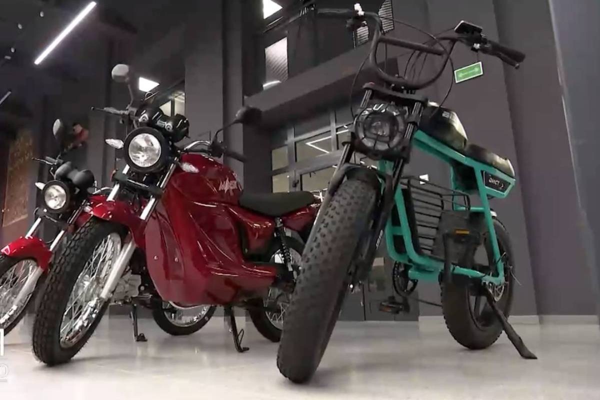 На фото рядом с мотоциклом – электровелосипед (гибрид) с мотоциклетными колесами, новинка от мотовелозавода, которую планируют начать продавать в этом году.
