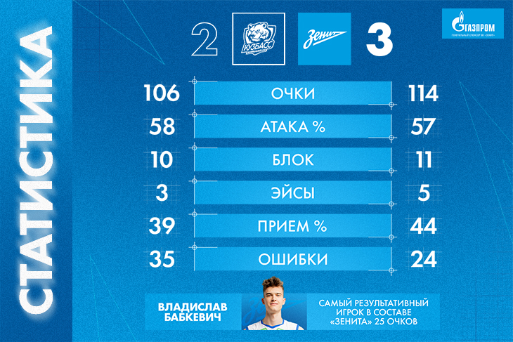 Пятая партия началась со счета 2:0 в пользу зенитовцев, а паузу Сергей Троцкий берёт при счете 1:4. Она пошла кемеровчанам на пользу и спустя пару минут на табло 4:4. Это был не единственный камбек хозяев: 6:9 для «Кузбасса» вновь превращаются в 9:9 и перерыв приходится брать Владимиру Алекно. В концовке партии все же сильнее оказались гости, которые, хоть и с минимальным преимуществом, но смогли одолеть хозяев со счетом 15:13. Самым результативным в составе «Зенита» стал Владислав Бабкевич, набравший 25 очков. «Зенит» продолжает победную серию в Суперлиге, которая составляет 13 матчей. Следующий матч сине-бело-голубые проведут также на выезде против лидера чемпионата, казанского «Зенита».