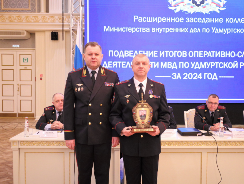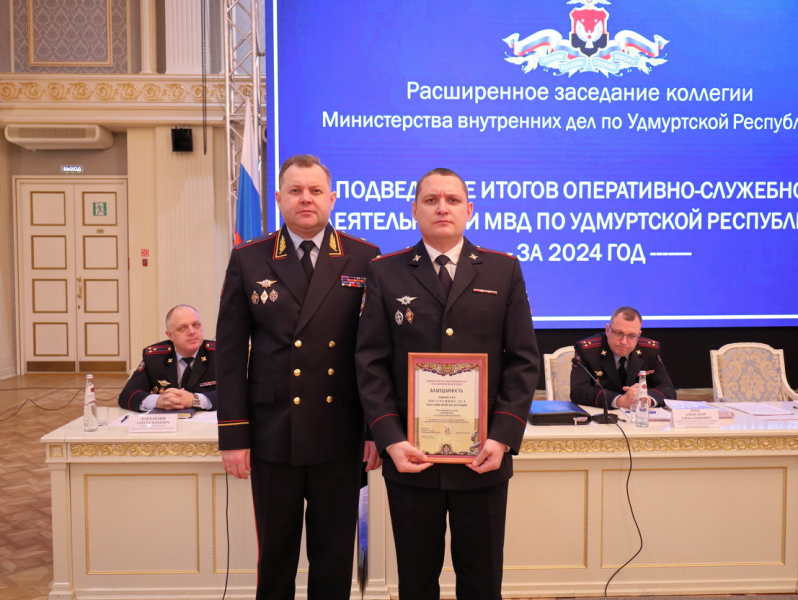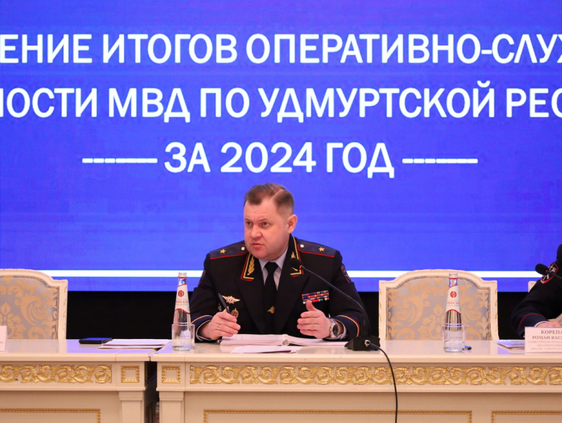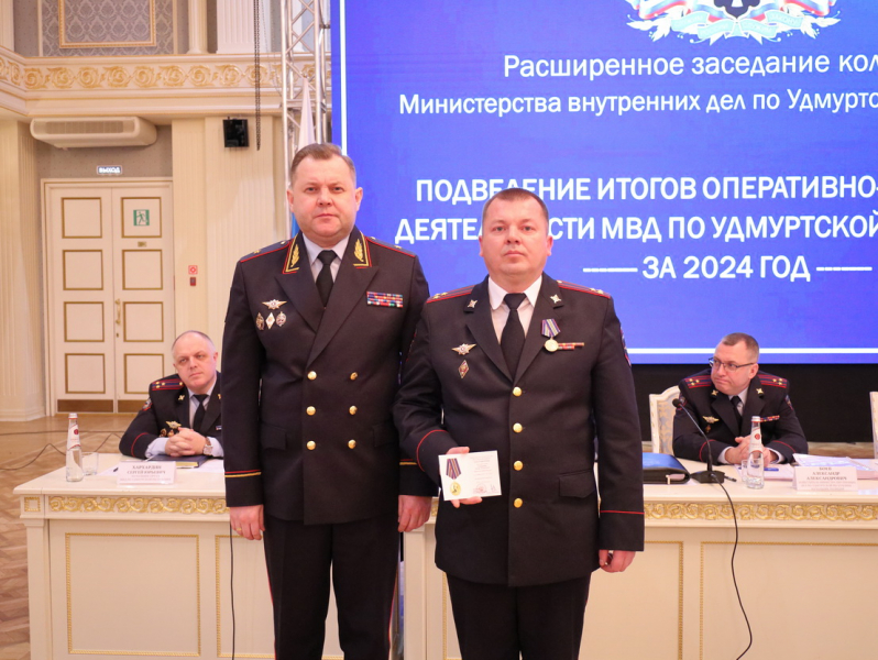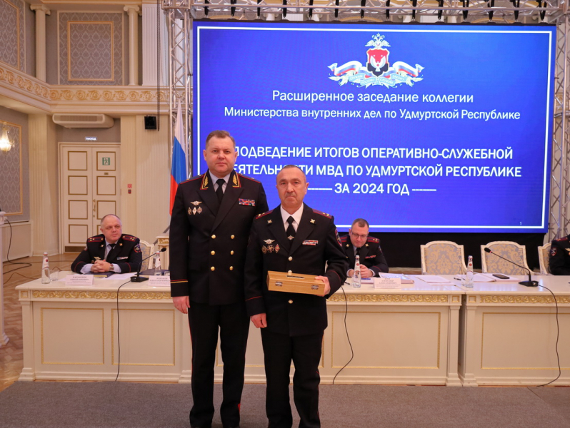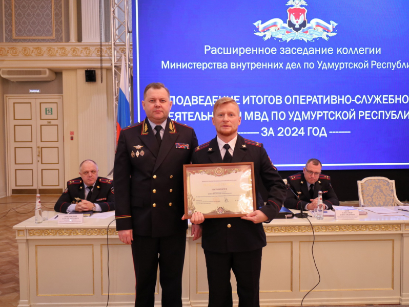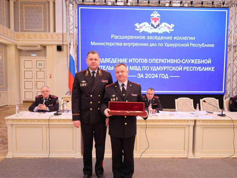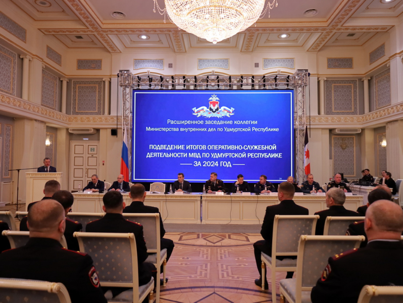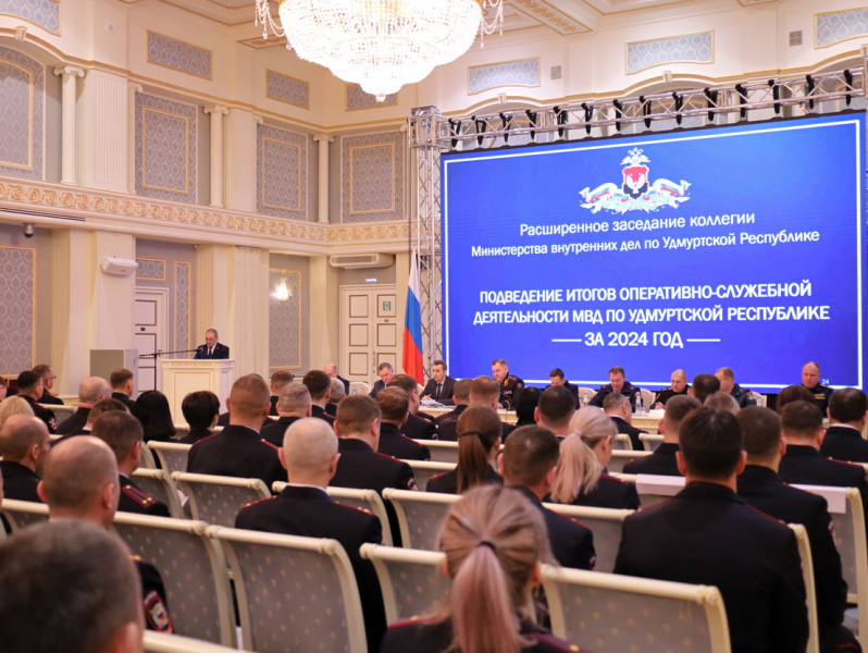 В Доме дружбы народов под председательством Министра внутренних дел по Удмуртской Республике генерал-майора полиции Максима Тихонова состоялось расширенное заседание коллегии МВД по Удмуртской Республике, посвященное подведению итогов деятельности за 2024 год. В заседании приняли участие: заместитель Председателя Правительства Удмуртии Ильяс Ханнанов, Председатель Государственного Совета Удмуртской Республики Владимир Невоструев, Главный федеральный инспектор по Удмуртской Республике Алексей Воробьев, руководители республиканских силовых ведомств.