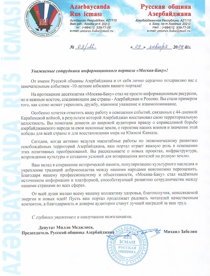 С глубоким уважением и наилучшими пожеланиями, депутат Милли Меджлиса Азербайджана, председатель Русской общины Азербайджанской Республики Михаил Забелин».