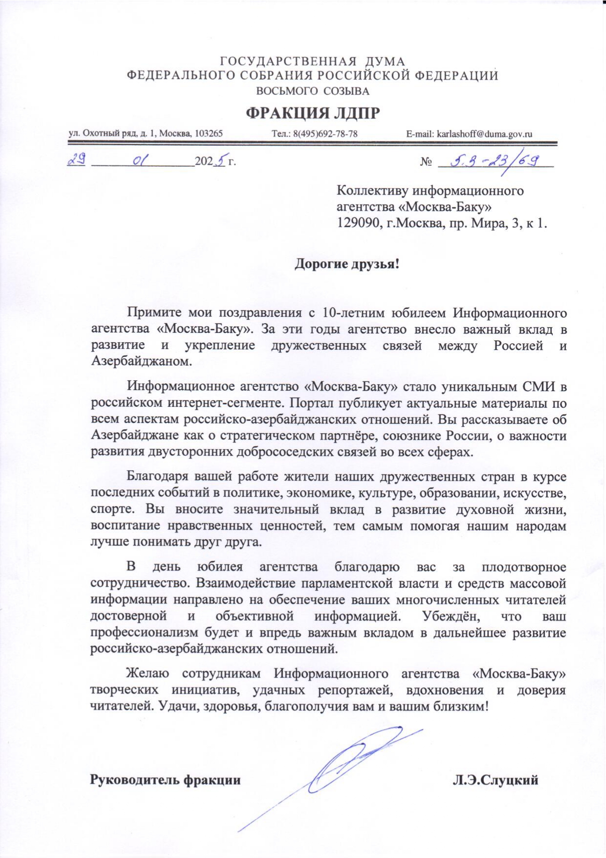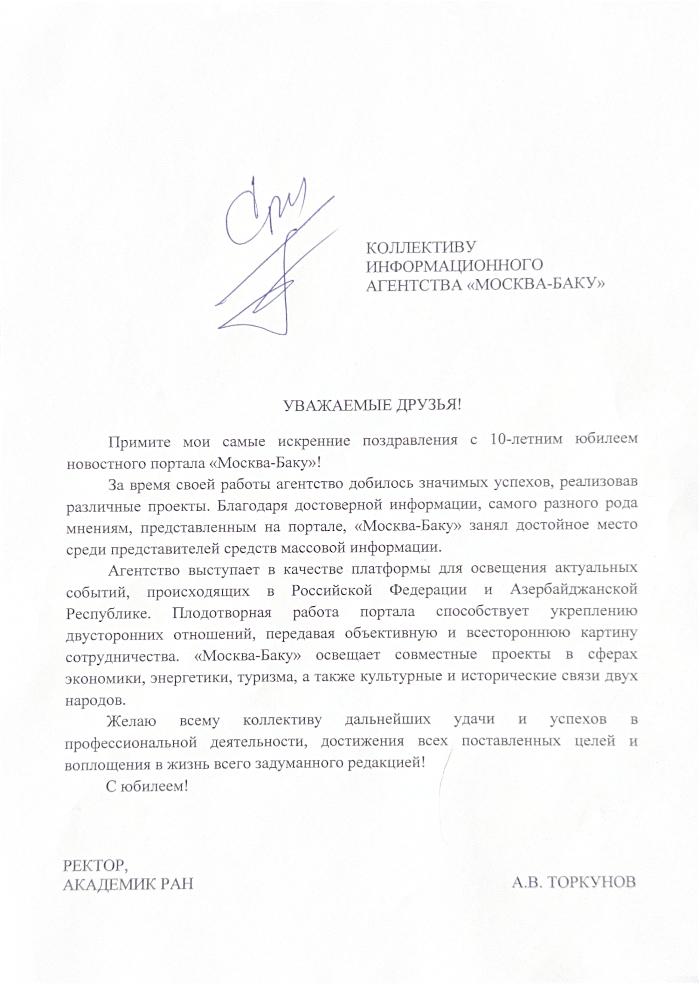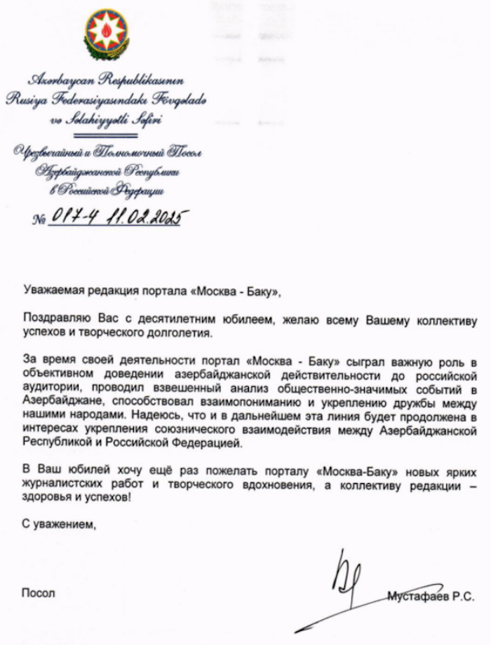 «Уважаемый коллектив информационного агентства «Москва-Баку»! Сердечно поздравляю вас с юбилеем портала.