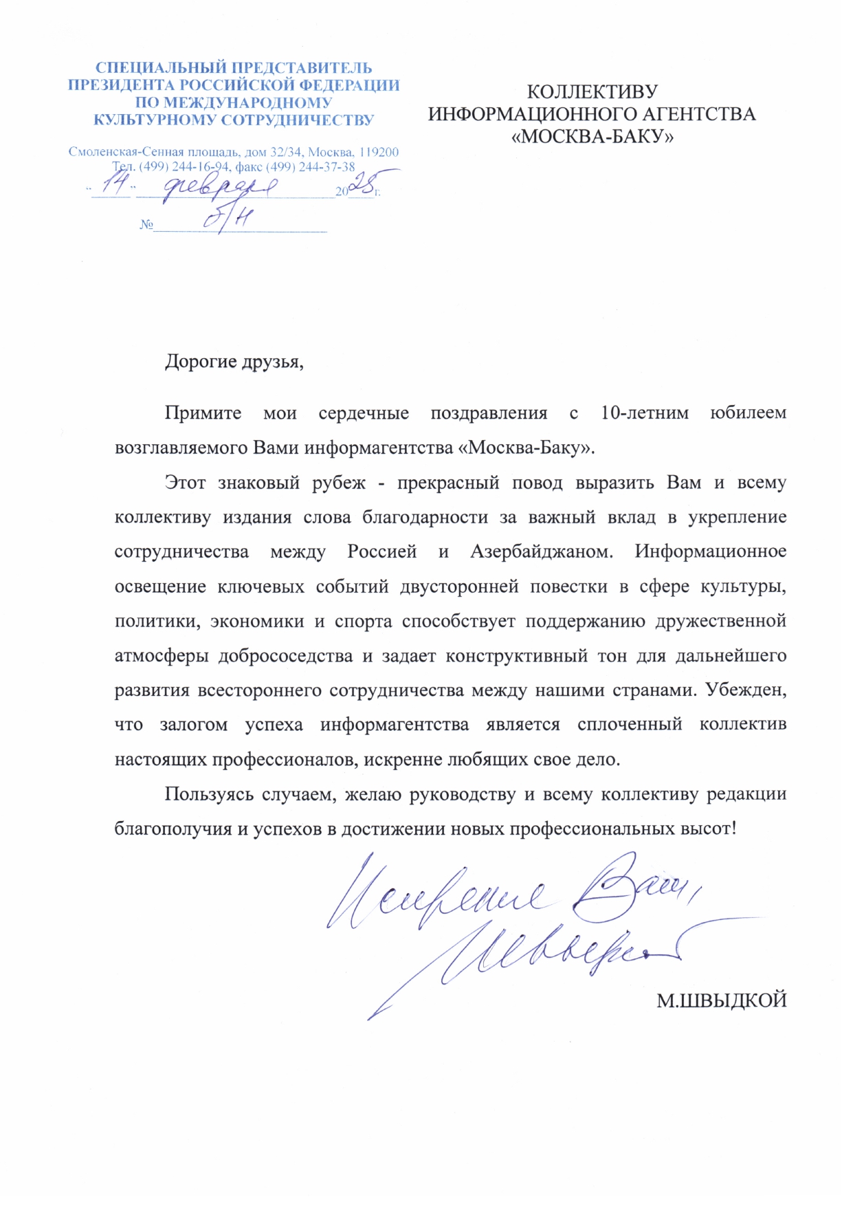 "Сердечно поздравляю коллектив информационного агентства «Москва-Баку» с 10-летием!