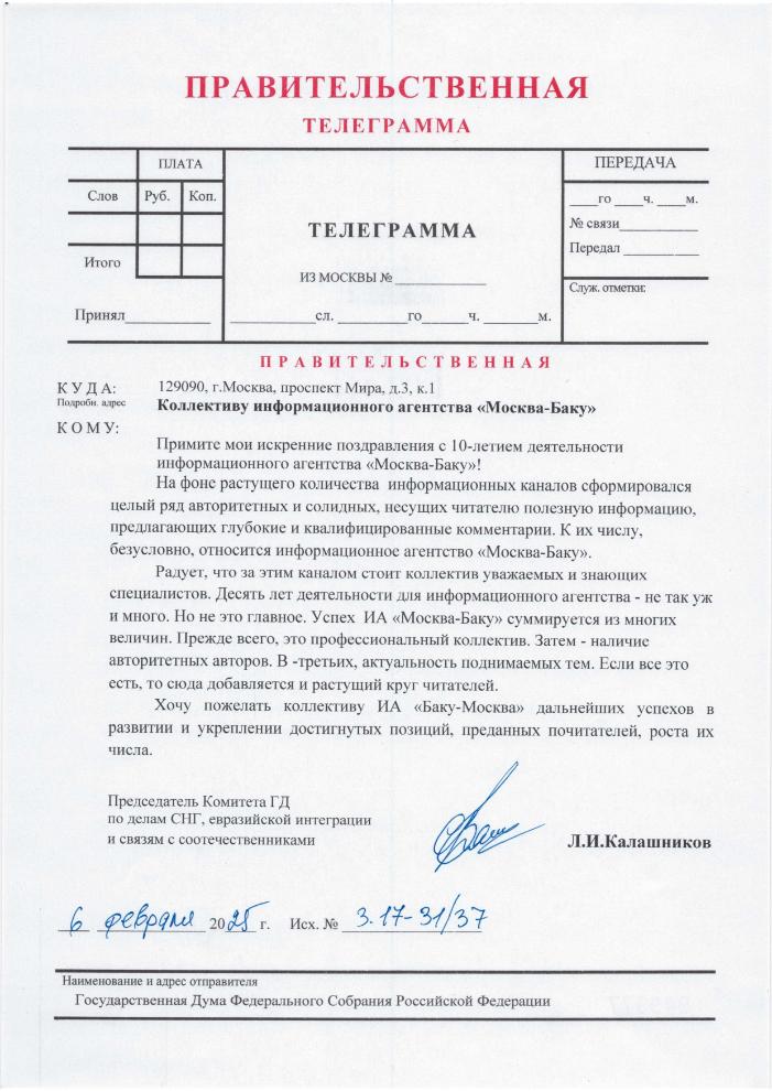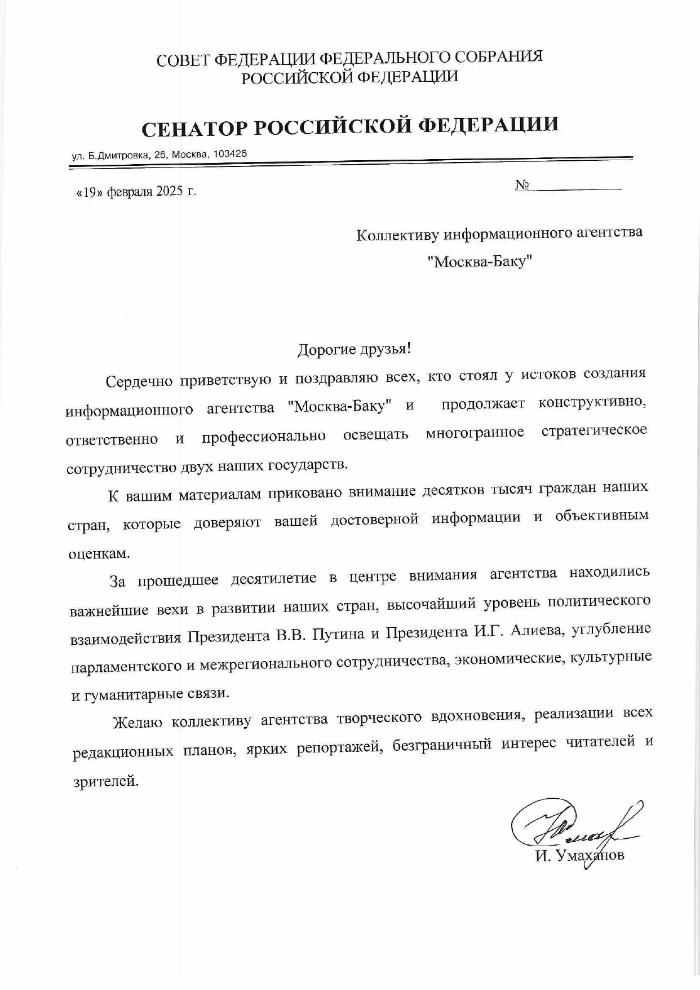 "Уважаемый коллектив информационного агентства «Москва-Баку»!