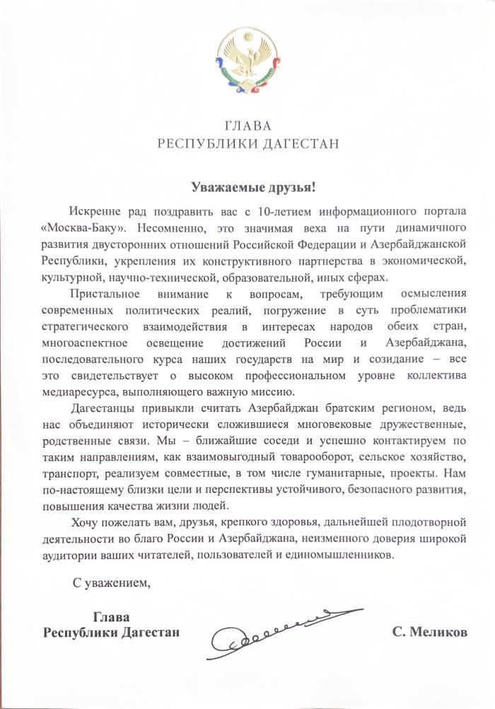 «Дорогие друзья, коллеги! Хочу поздравить вас с юбилеем. 10 лет российско-азербайджанский информационный портал «Москва-Баку» занимается исключительно важным делом. Вы не просто информируете о самых значительных событиях в наших государствах, вы сближаете народы и культуры наших стран, позволяете нам лучше узнавать друг друга. Объективная информация о политике обоих государств, о развитии наших культурных и гуманитарных связей, о взаимодействии в области экономики, обо всех главных событиях, происходящих в России и Азербайджане, имеет исключительно важное значение для наших связей. За достаточно короткий срок вы смогли завоевать доверие и уважение своих читателей. 10 лет вашей деятельности позволяют сделать безусловный вывод о важности вашего портала. Поздравляю и желаю всегда держаться на подобном уровне!