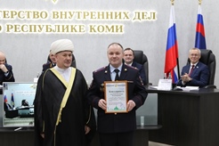 Вклад полицейских в сохранение и развитие духовно-нравственных ценностей на территории Республики Коми отметил председатель Центральной религиозной организации «Духовное управление мусульман Республики Коми» Валиахмад Гаязов. Он вручил Почетную грамоту от своего имени Министру внутренних дел по Республике Коми Андрею Сицскому, а благодарности за организацию работы по профилактике межрелигиозных и межнациональных конфликтов, гражданско-патриотическому воспитанию молодежи – начальнику Центра по противодействию экстремизму МВД по Коми Владимиру Сямтомову и начальнику ОМВД России «Усинский» Андрею Ямиеву.