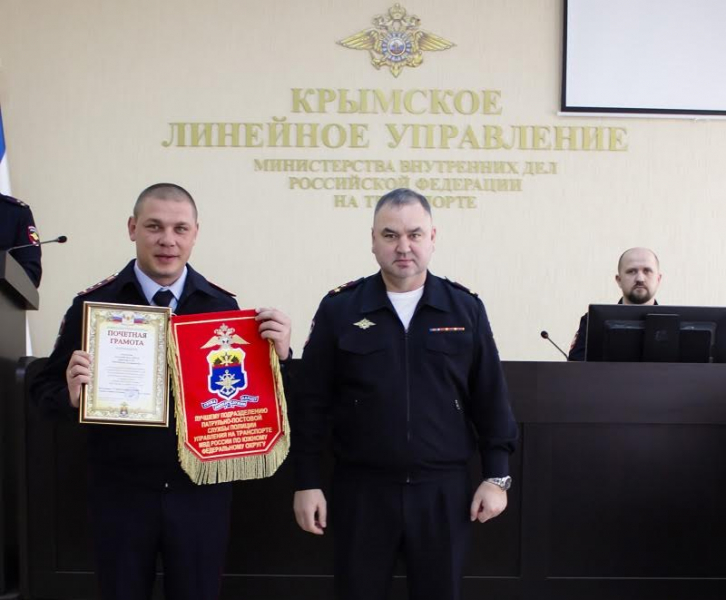 После чего, он вручил почетные грамоты и переходящие вымпела УТ МВД России по ЮФО за победу в коллективном соревновании дежурной части Крымского ЛУ, отдельной роте патрульно-постовой службы полиции Крымского ЛУ, следственному отделу Крымского ЛУ и штабу Крымского ЛУ.