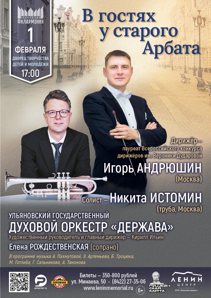 Ульяновский государственный духовой оркестр «Держава» представит концерт современной музыки для трубы и духового оркестра, ранее не исполнявшейся в Ульяновске. В программе прозвучат произведения российских и зарубежных композиторов, включая увертюру «Палехский сувенир» В. Шепелева, концерт для трубы А. Пахмутовой и поэму «Новоспасское» Г. Сальникова. Солист — трубач Никита Истомин (Москва), дирижеры — Кирилл Ильин и лауреат Всероссийского конкурса дирижеров Игорь Андрюшин. Вокальные партии исполнит сопрано Елена Рождественская.