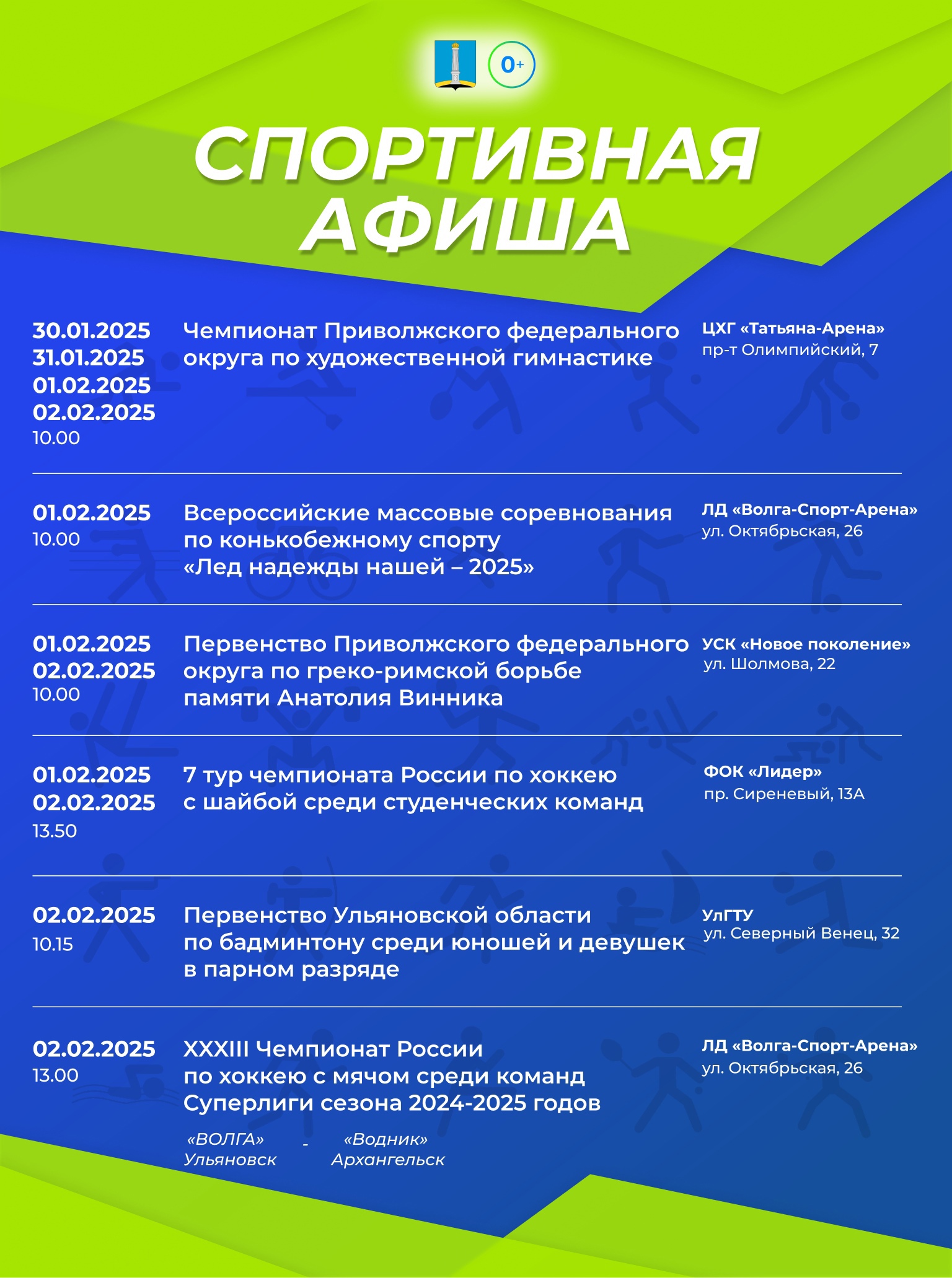 Пускай погода за окном продолжает капризничать, для нас это не повод падать духом. Возможно, катки в парках и не в лучшем своем состоянии, зато региональный Минспорт дает возможность каждому почувствовать себя конькобежцем на «Волга-Спорт-Арене». Также креативное пространство «Квартал» покажет нам фестивальное короткометражное кино, а Ульяновский областной художественный музей предлагает поразмышлять на тему пушкинского наследия и того, как оно откликается в каждом из нас.