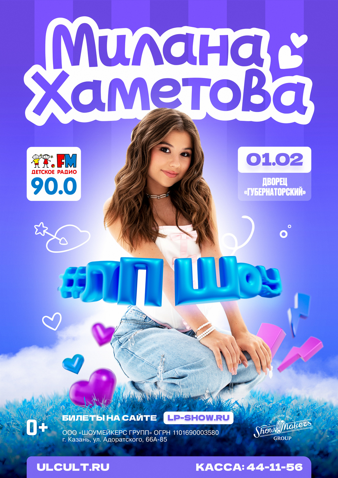 Милана Хаметова — юная звезда российской поп-сцены, блогер и певица, чьи песни завоевали популярность среди молодежи. В рамках первого сольного тура «ЛП—шоу» прозвучат известные хиты «Умка», «ЛП», «Купи пёсика», а также новые треки.