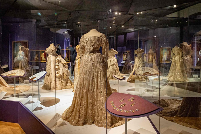 Русский императорский двор славился на весь мир своей изысканностью и богатством. Понятие «двор» было многогранным и включало в себя императорскую семью, высших сановников, придворную свиту, императорские дворцы, где проходили официальные церемонии, парады, грандиозные балы и трапезы. Все это создавало величественный образ государства с высоким международным статусом. Французский посол М. Палеолог вспоминал: «По пышности мундиров, по роскоши туалетов, по богатству ливрей, по пышности убранства, общему выражению блеска и могущества зрелище так великолепно, что ни один двор в мире не мог бы с ним сравниться» (цитата с сайта Исторического музея). Украшения, платья и аксессуары, представленные на выставке, созданы известными дизайнерами и ювелирными домами, в том числе Lalique, Tiffany и Фаберже.