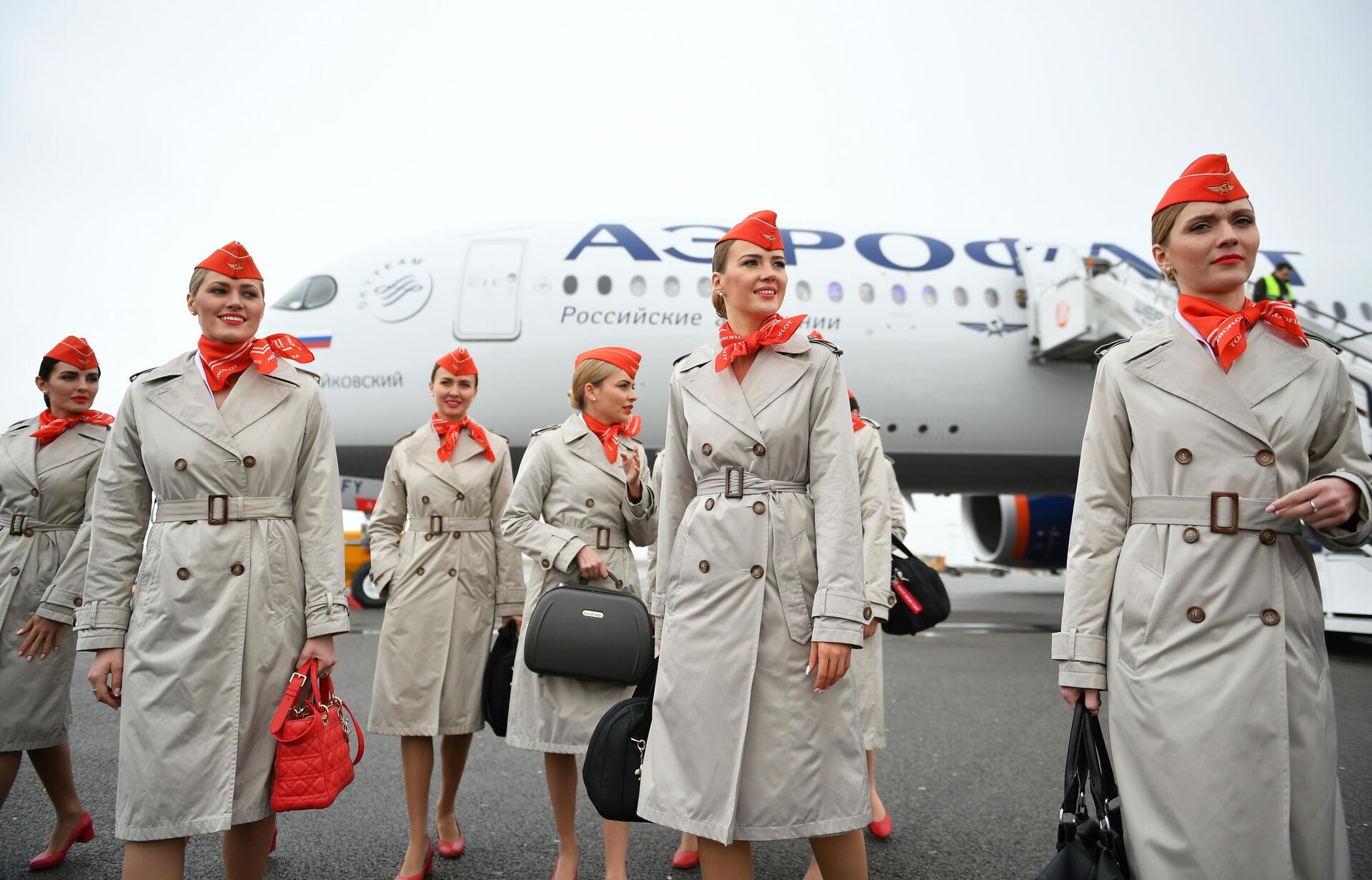 Стюардессы у пассажирского самолета Airbus A350-900 авиакомпании "Аэрофлот" в международном аэропорту Шереметьево имени А. С. Пушкина в Москве, Россия, 2020 год