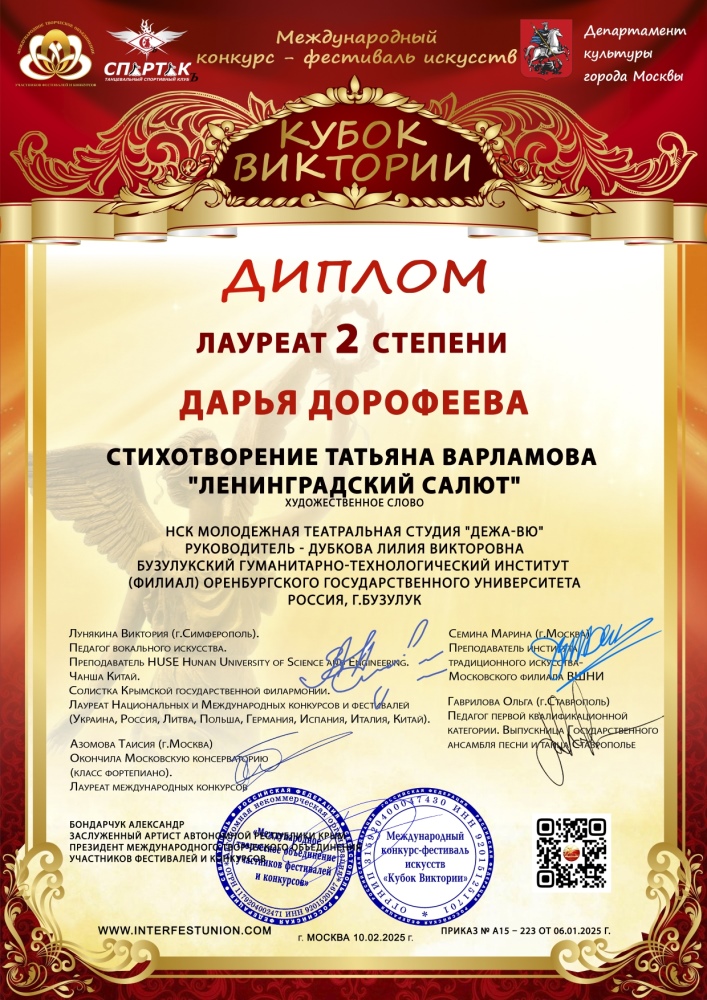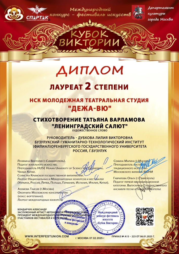 Народный самодеятельный коллектив молодежная театральная студия «Дежа-вю» Бузулукского гуманитарно-технологического института (филиала) ОГУ в очередной раз подтвердила свой высокий уровень, завоевав лауреата 2 степени на престижном международном конкурсе-фестивале искусств «Кубок Виктории»! Проникновенное исполнение стихотворения «Ленинградский салют» стало одним из самых ярких моментов фестиваля, покорив сердца жюри и зрителей.