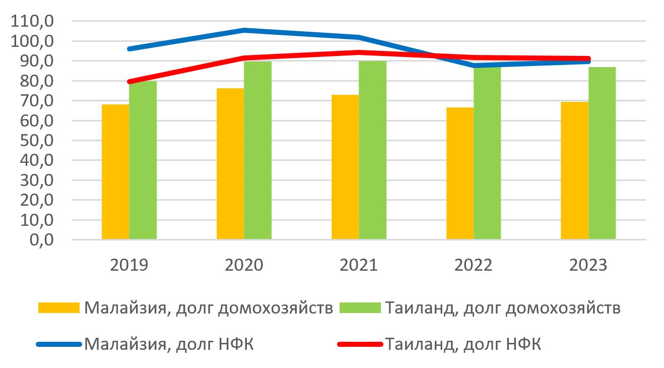 График 4. Задолженность нефинансовых корпораций (НФК) и домохозяйств в Малайзии и Таиланде, в % от ВВП