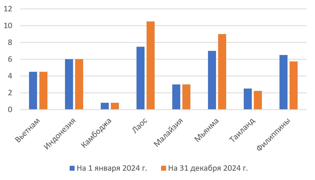 Позитивный тренд — снижение темпов инфляции в большей части ЮВА по сравнению с 2023 г., что совпадает с глобальной тенденцией (Таблица 2).