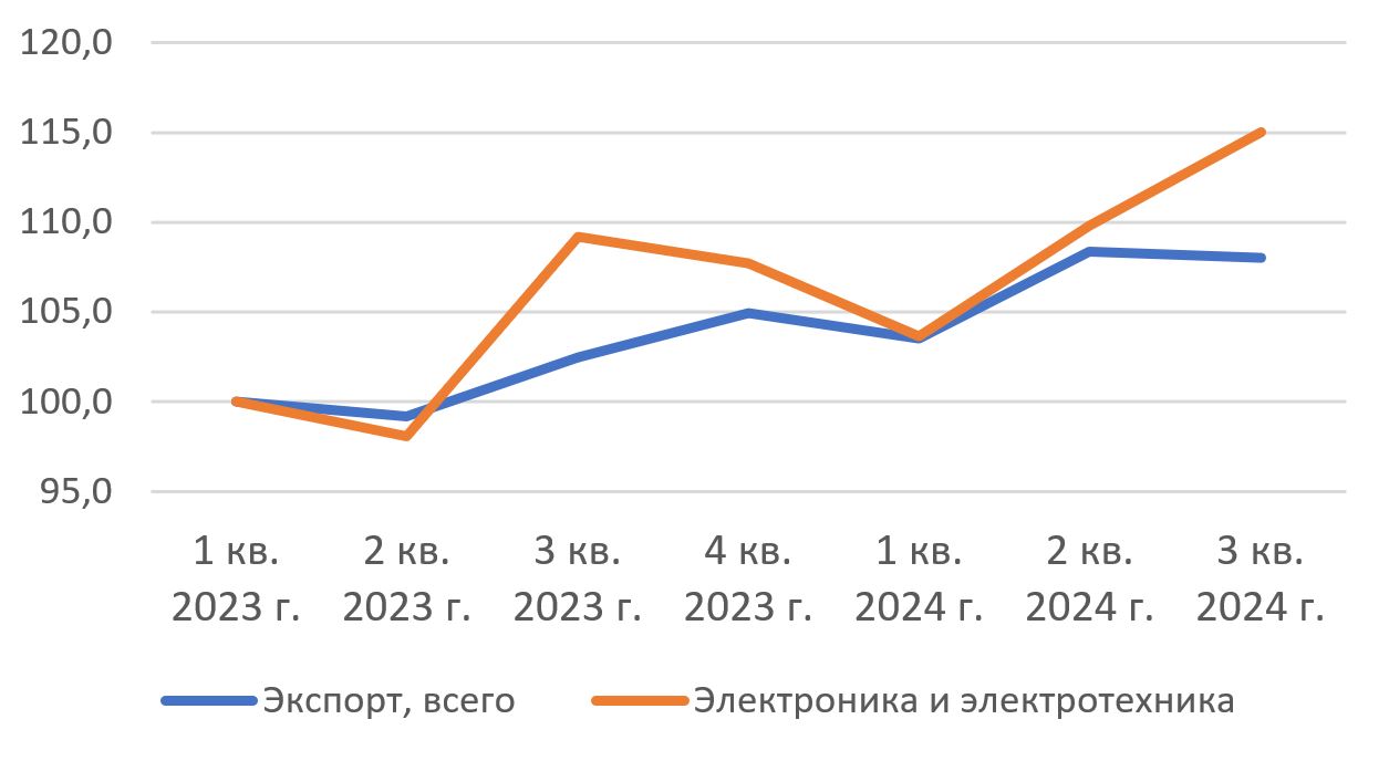 График 2. Поквартальная динамика экспорта стран ЮВА: общего / электроники и электротехники, % к 1 кв. 2023 г.