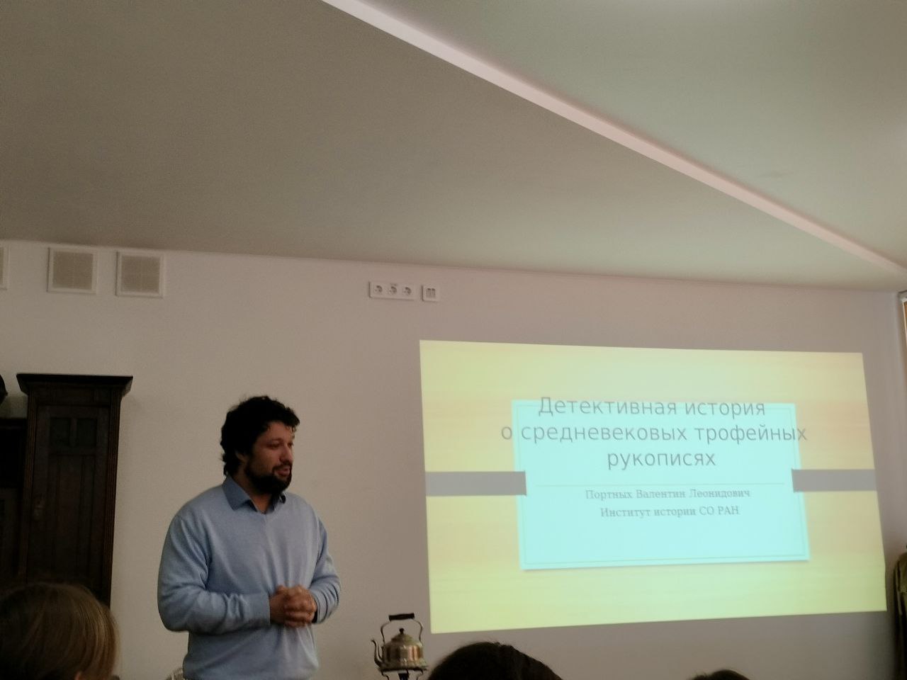 Лекция «Детективная история о средневековых трофейных рукописях» доктора исторических наук, научного сотрудника Института истории В.Л. Портных была посвящена истории немецких средневековых рукописей из Любека, Гамбурга и Бремена, относящихся к категории «перемещенных культурных ценностей». На конкретном примере была показана вся сложность и неоднозначность вопроса вывоза подобных материалов из Германии, а также место «перемещенных ценностей» в международных отношениях последующих десятилетий.