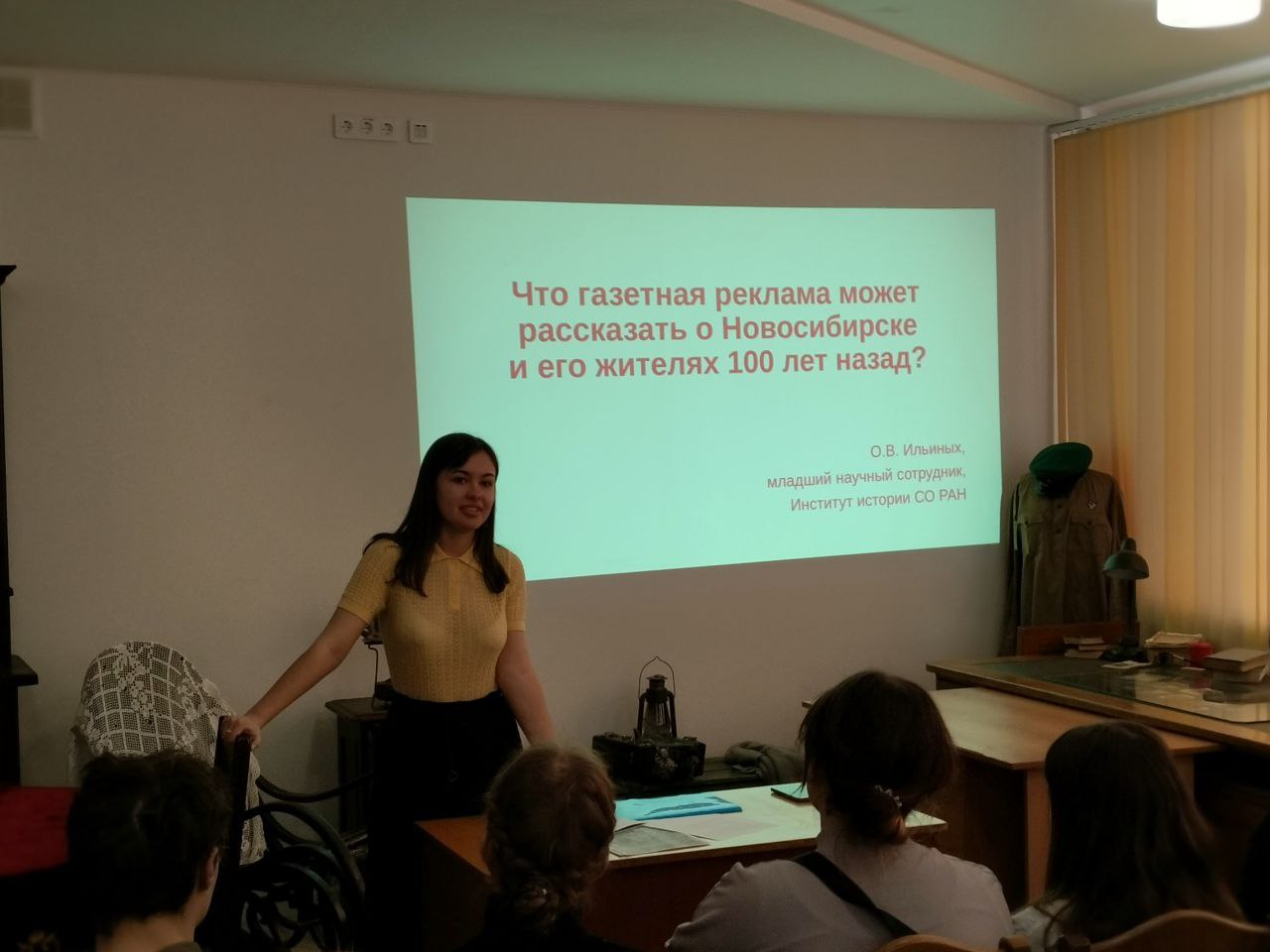 Особый интерес вызвала лекция младшего научного сотрудника Института истории О.В. Ильиных «Что газетная реклама может рассказать о Новосибирске и его жителях 100 лет назад?». Лектор рассказала о повседневной жизни города в 1920-е гг., продемонстрировав ее многогранность, на примерах газетной рекламы сначала для учащихся МАОУ «Гимназия №5» (учитель Т.В. Зверева), а затем для учащихся МБОУ «Средняя общеобразовательная школа № 119» (учитель И.А. Шаламова и педагог-организатор К.В. Сорокин).