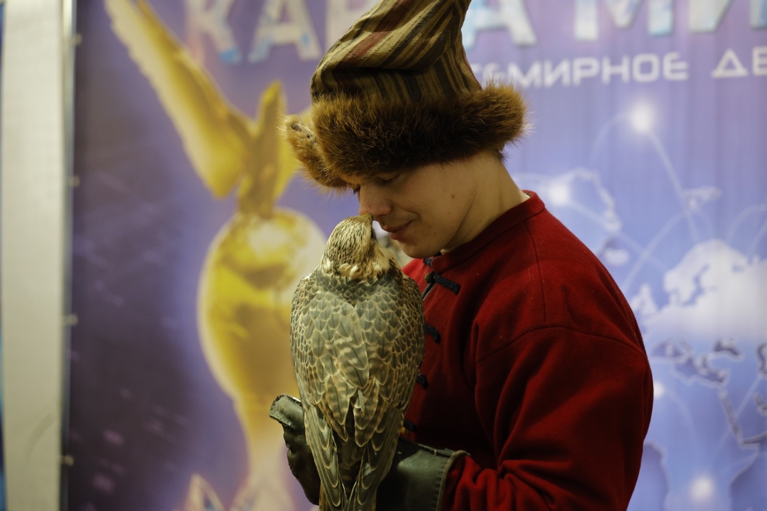 А на пресс-воле на руке актера-стрельца важно восседала птица сокол, являющаяся символом солнца и света, победы и превосходства, защиты и свободы, путеводителем всемирного движения «Карта мира».