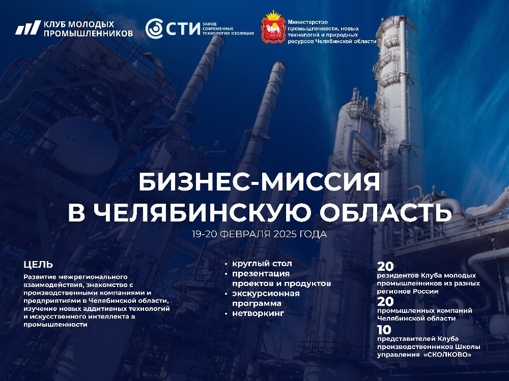 Молодые промышленники из разных регионов страны съедутся в Челябинск, где 19-20 февраля пройдёт бизнес-миссия «Развитие и внедрение аддитивных технологий, применение искусственного интеллекта в промышленности». Революционные направления развития обсудят порядка пятидесяти руководителей предприятий - резидентов Клуба молодых промышленников из Челябинской и Свердловской областей, Санкт-Петербурга, Красноярского края, Удмуртской Республики, а также представители Клуба производственников Школы управления «Сколково». К диалогу приглашаются и топ-менеджеры челябинских компаний, не входящих в состав объединений.