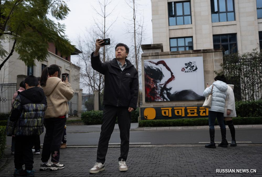 8 февраля 2025 года, зрители фотографируются на память рядом с компанией Chengdu Coco Cartoon Co., Ltd., которая выпустила фильм “Нэчжа-2”, в городе Чэнду провинции Сычуань на юго-западе Китая.