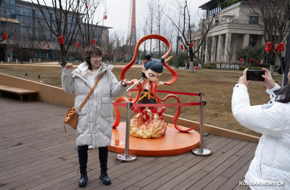 8 февраля 2025 года, зрительница позирует для фото с фигурой Нэчжа, главного героя одноименного анимационного фильма, возле торгового комплекса Gazelle Digital Cultural and Creative Valley в городе Чэнду провинции Сычуань на юго-западе Китая.