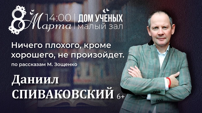 Начинаем уже в 14.00: в малом зале Дома ученых Академгородка для вас на сцене Даниил Спиваковский. Заслуженный артист России, артист театра и кино даст моноспектакль «Ничего плохого, кроме хорошего, не произойдет» по мотивам произведений Михаила Зощенко.