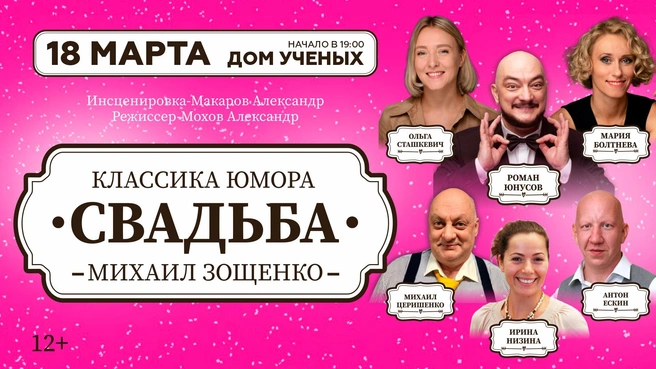 Новая версия всеми любимого произведения Михаила Зощенко «Свадьба» на сцене Дома ученых 18 марта. Вас ожидает яркий костюмированный спектакль, рассказанный неповторимым языком мастера советской сатиры и юмора, который перенесет вас во времена НЭПа 30-х годов ХХ века.