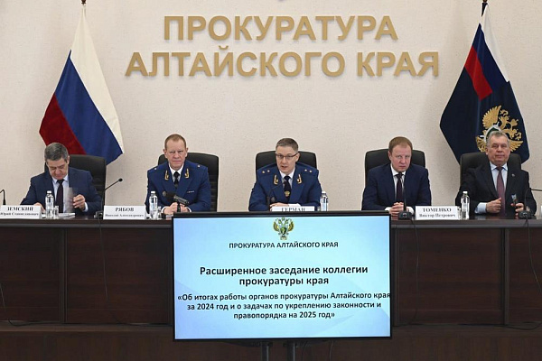 Сегодня, 19 февраля, в Барнауле состоялось заседание коллегии прокуратуры Алтайского края, где подвели итоги работы ведомства за 2024 год и определили задачи на 2025 год. В работе коллегии приняли участие начальник управления Генеральной прокуратуры Российской Федерации по Сибирскому федеральному округу Николай Рябов, прокурор региона Антон Герман, Губернатор края Виктор Томенко, председатель Алтайского краевого Законодательного Собрания Александр Романенко, Главный федеральный инспектор по Алтайскому краю Юрий Земский, руководители судебных и правоохранительных органов. Открывая заседание, Николай Рябов дал оценку состоянию законности и правопорядка в Алтайском крае. Он отметил, что прокуратурой региона во взаимодействии с органами власти и правоохранительными ведомствами проделана значительная работа по защите прав жителей Алтайского края, обеспечению общественной безопасности, экономической и финансовой устойчивости региона. Прокурор края Антон Герман и его заместители доложили о результатах надзорной деятельности, в рамках которой пресечено 73 тыс. нарушений закона. Принятые меры позволили защитить права более 10 тыс. граждан, в том числе вернуть долги по зарплате в размере 117 млн рублей. В результате прокурорского вмешательства дополнительно выделено на решение социально важных вопросов свыше 10 млрд рублей. Обеспечен высокий уровень реализации национальных проектов – создано и обновлено более 370 социальных объектов. Мерами судебного понуждения в собственность государства возвращены 1,8 тыс. гектаров земель сельхозназначения и свыше 1,3 млрд рублей, пресечена легализация 600 млн рублей. Под надзором прокуроров публичными заказчиками погашена задолженность перед предпринимателями в размере 260 млн рублей, не допущено проведение более 2,3 тыс. незаконных проверок хозяйствующих субъектов. В конструктивном диалоге с исполнительной и законодательной властью велась нормотворческая работа. По инициативе региональной прокуратуры принято около 2,5 тыс. правовых актов. Из реестра проблемных объектов исключены все долгострои, восстановлены права 209 дольщиков. Александр Романенко в своем выступлении напомнил, что в нашем регионе прокурор является субъектом законодательной инициативы с момента принятия Устава края в 1995 году. При этом он отметил, что наиболее активно реализация этого права прокурором наблюдается именно в последние годы. В частности, из более 50 законопроектов, разработанных прокуратурой за 30 лет существования краевого Законодательного Собрания, 25 были внесены действующим прокурором региона. «За минувший год прокурором края внесено в Законодательное Собрание семь законопроектов. Среди всех субъектов права законодательной инициативы прокурор занимает по итогам 2024 года третье место по числу внесенных законопроектов после Губернатора края и профильных комитетов АКЗС», - рассказал спикер краевого парламента. Председатель АКЗС отметил, что эти законопроекты, как правило, имеют большое социальное значение и вызывают широкий общественный резонанс. В качестве примера он привел закон об ограничении продажи спиртного в некоторые праздничные дни – в День Победы и в дни городов, сел и районов, а также изменения в закон «О регулировании отдельных лесных отношений на территории Алтайского края», которы