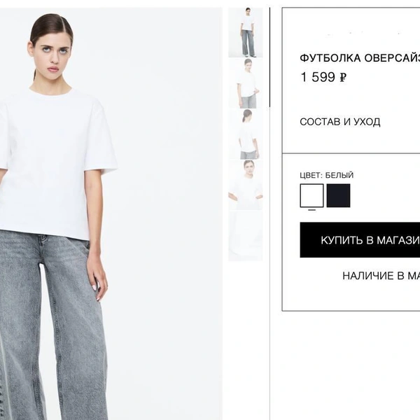 Но возьмем другой пример. Белая оверсайз футболка из хлопка. Состав тот же, модели — почти идентичные. Zara — 1 077 рублей, Maag — 1 599 рублей, Bershka — вообще 911 рублей, LIMЕ — 2 299 рублей.