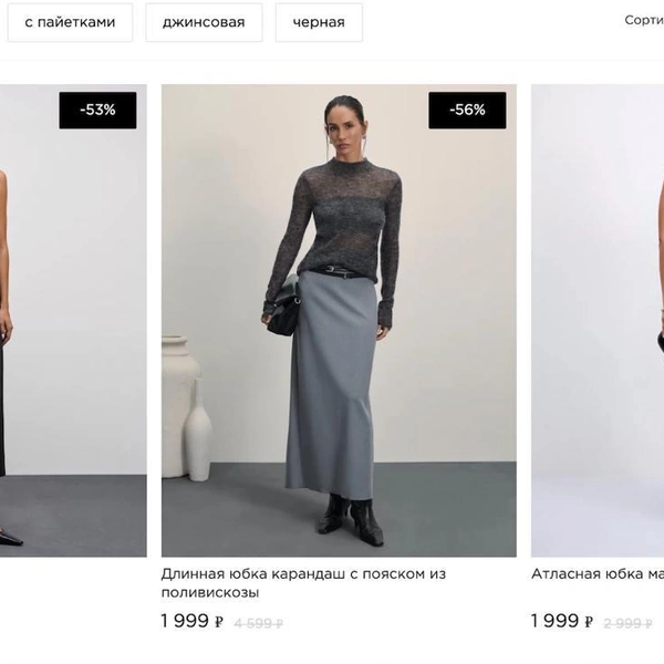 Идем дальше. С верхом с короткими рукавами все понятно — ищем лонгслив. Черный из плотного хлопка на сайте Maag — 2 599 рублей, Zara — 2 538 рублей. Присмотрим юбку. Черная макси из полиэстера: 39 долларов, или 3 822 рубля, — на сайте Zara, и 3 999 — в Maag. Та же история с мини-юбкой схожего фасона — разница в цене 0,6 %.