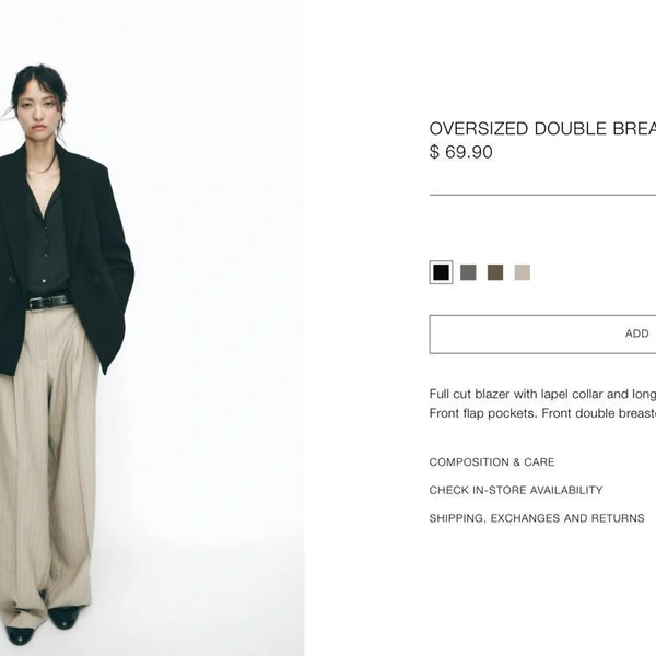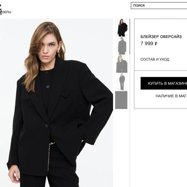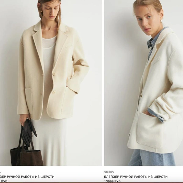 Причем отследить тенденцию (допустим, верхняя одежда в Maag дешевле, зато повседневные верх и низ — дороже) не выходит. Возьмем пиджаки. Черный блейзер из полиэстера и вискозы в соотношении 2 к 1 — 69 долларов (6 762 рубля) и 7 999 рублей. Победила Zara. Берем серый оверсайз блейзер: в Zara — 74 % полиэстер, 21 % вискоза, в Maag — 72 % и 24 %. 69 долларов (6 850 рублей) против, внезапно, 1 999 рублей. Без скидки — 5 999 рублей. Очко в пользу Maag.