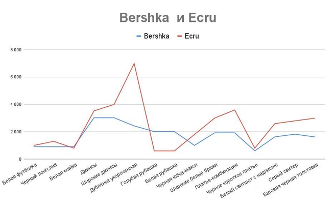 На смену Bershka пришел ECRU — в этой паре все оказалось чуть проще. По большинству рассмотренных позиций в ECRU цены выше. Тут следует оговорить, что в магазине бренда на маркетплейсах и точке в «Галерее» многим предметам одежды из Bershka аналогов не нашлось, зато хватало своего. Так что работаем с тем, что есть.