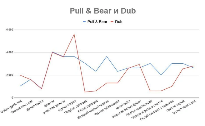 Цены на худи, свитшоты и брюки примерно одинаковые — в пределах трех тысяч. Широкие синие джинсы в Pull & Bear — 3 642 рубля, в Dub — 3 599 рублей.