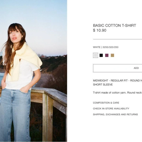 Возьмем белую хлопковую футболку оверсайз: Zara — 10,9 доллара (1 077 рублей), Maag — 1 599 рублей. Или белое боди на тонких бретелях: Zara — 12,9 доллара (1 264 рубля), Maag — 1 999 рублей. Джинсы-палаццо — 49,9 доллара (4 890 рублей) и 5 599 рублей. Пока выходит, что в Zara дешевле. Выигрывает ушедший бренд и в цене на платья и рубашки. Почти идентичные модели, те же материалы.