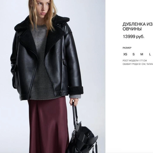 Перейдем к позициям подороже. Укороченная дубленка, состав — все тот же полиэстер. Zara — 109 долларов (10 682 рубля), Maag — 2 999 рублей. Аж на 70 % дешевле. Та же история с черной курткой-косухой — 6 850 рублей против 5 999. Свободная рубашка в полоску у нового бренда на 26 % дешевле, свитшот — на 13 %.