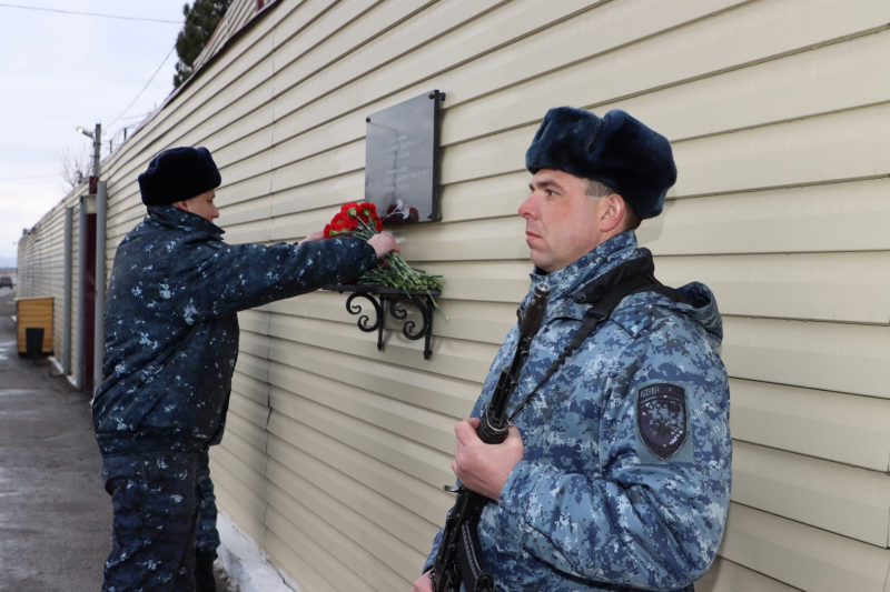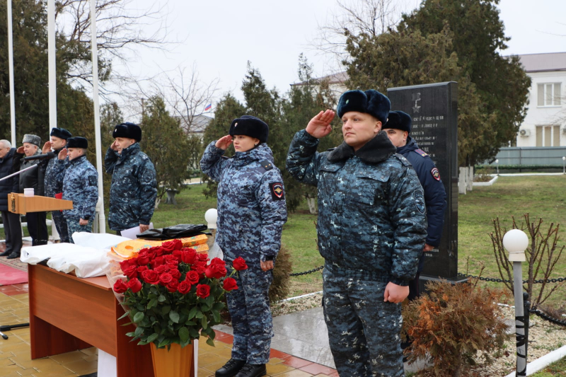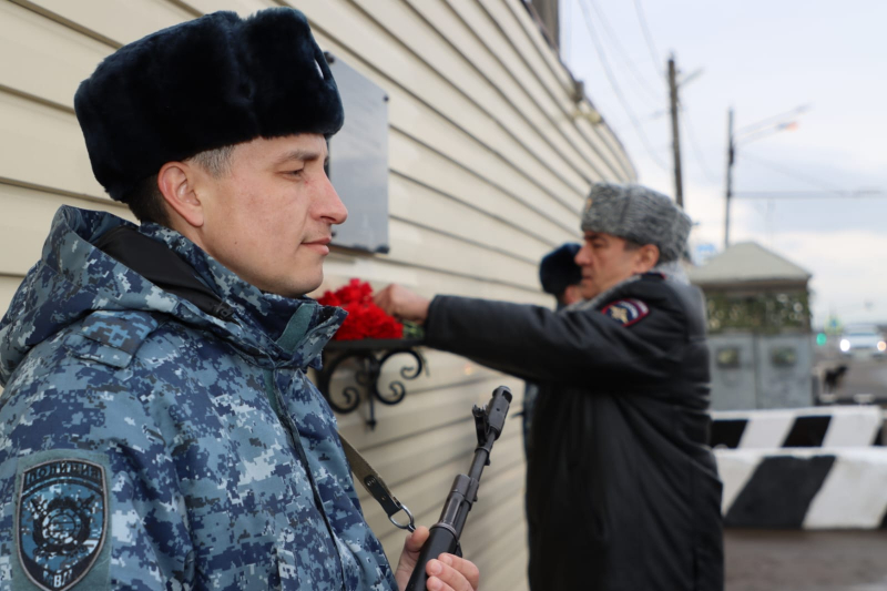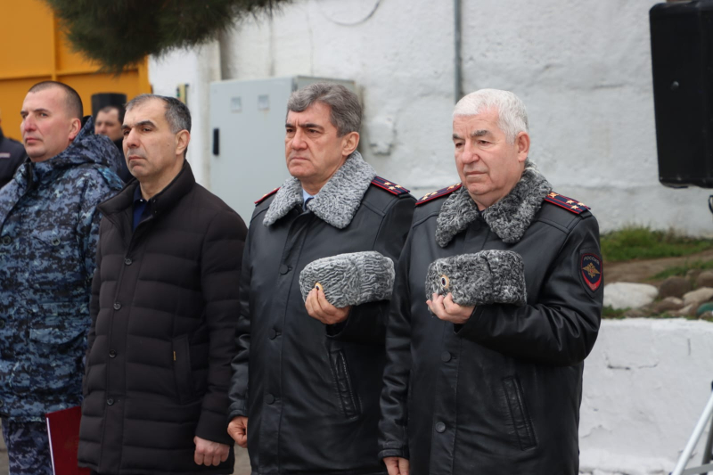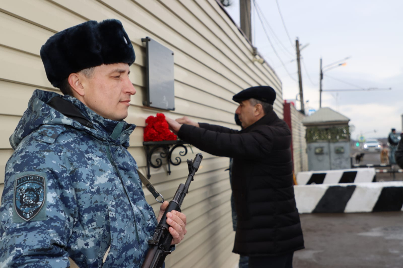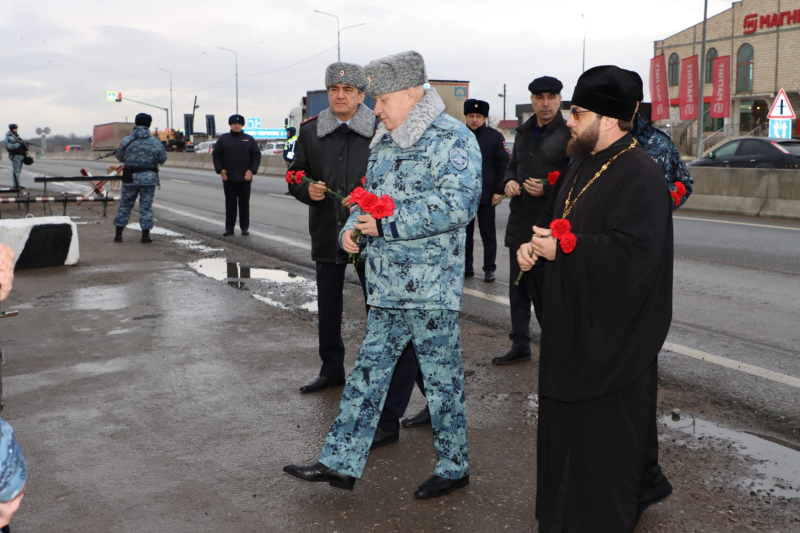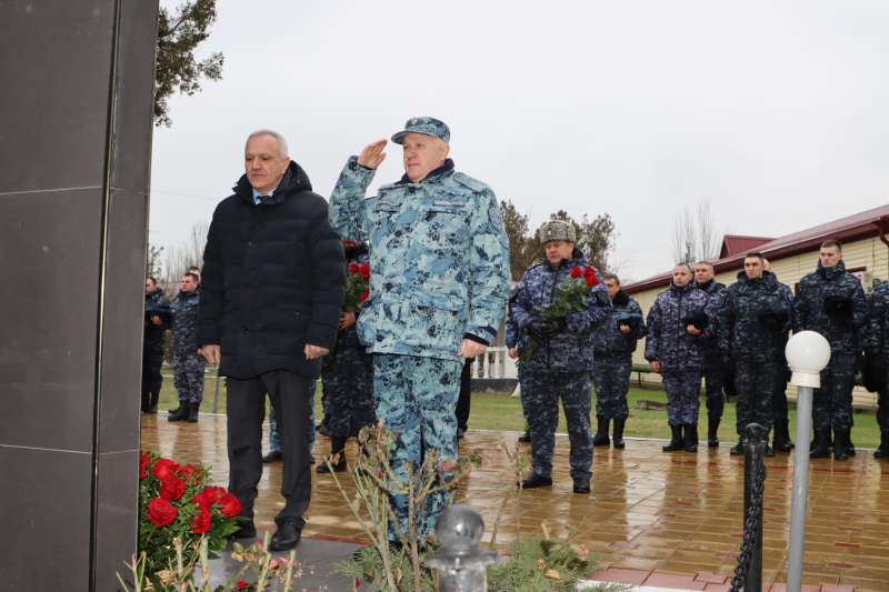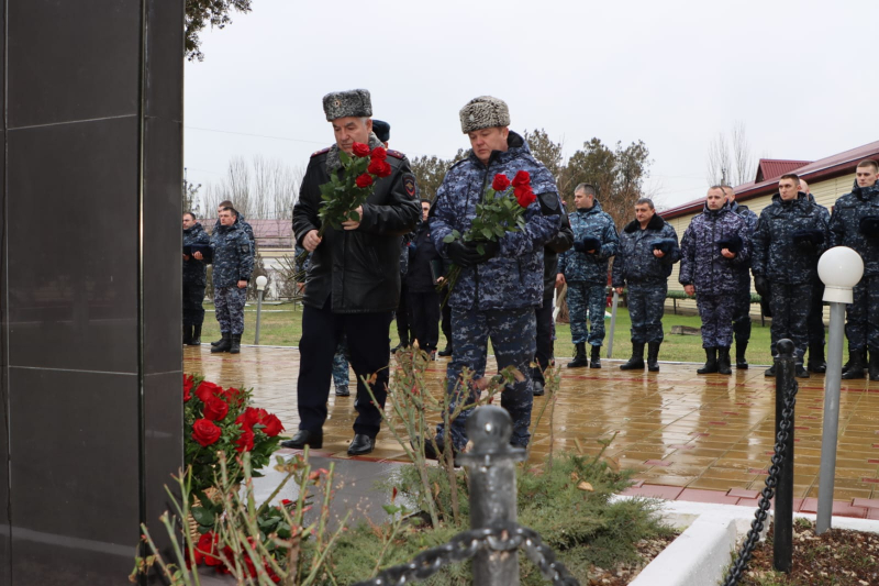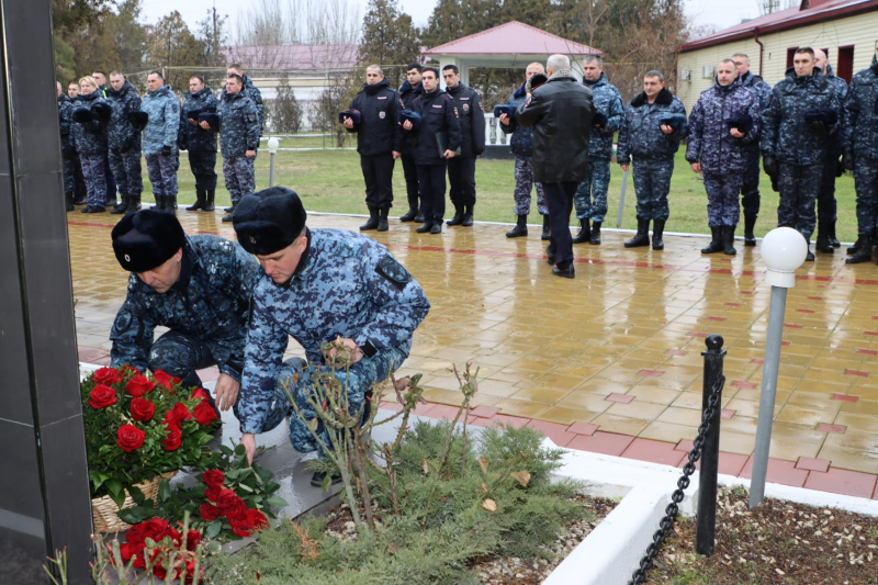 В завершение мероприятия Юрий Арсентьев, Абдурашид Магомедов, Сахават Сахаватов, руководство и личный состав ВОГ возложили цветы к мемориалу сотрудникам полиции, погибшим при исполнении служебного долга.