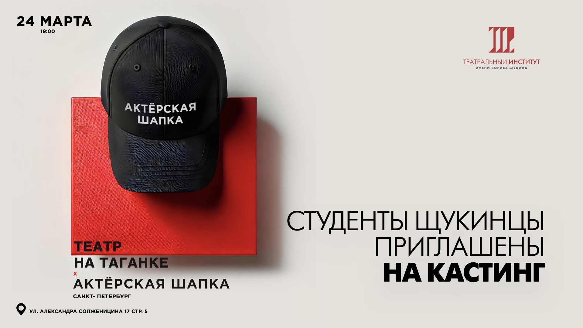 «Актёрская шапка» — это уникальное мероприятие для актёров в формате открытого кастинга родом из Санкт-Петербурга, которое предоставляет возможность выступить перед профессиональной публикой и членами жюри, состоящими из кастинг-директоров, агентов, режиссёров, продюсеров и мастеров цеха.