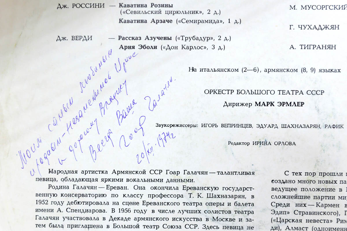 Известно, что Ирина Архипова долгие годы выступала на оперной сцене с Владиславом Пьявко. На конвертах имеется немалое количество уважительных и теплых дружеских обращений в адрес коллеги в частности и замечательного творческого дуэта в целом: «Моим самым любимым и родным — незаменимой Ирине и дорогому Владику всегда Ваша Гоар Галачян. 20.12.1974»
