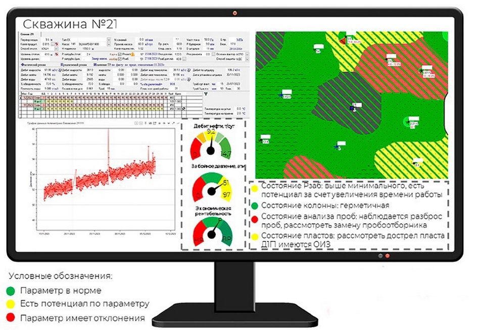 Это автоматизированная платформа, которая объединяет данные о работе скважины, анализирует их и предлагает решения для оптимизации. Она помогает удаленно контролировать параметры работы оборудования, автоматически подбирать геолого-технические мероприятия (ГТМ), предупреждать о возможных сбоях, сохранять максимальную производительность, контролируя различные параметры. Благодаря программе снижается человеческий фактор, ускоряется принятие решений, увеличивается добыча, снижаются затраты.