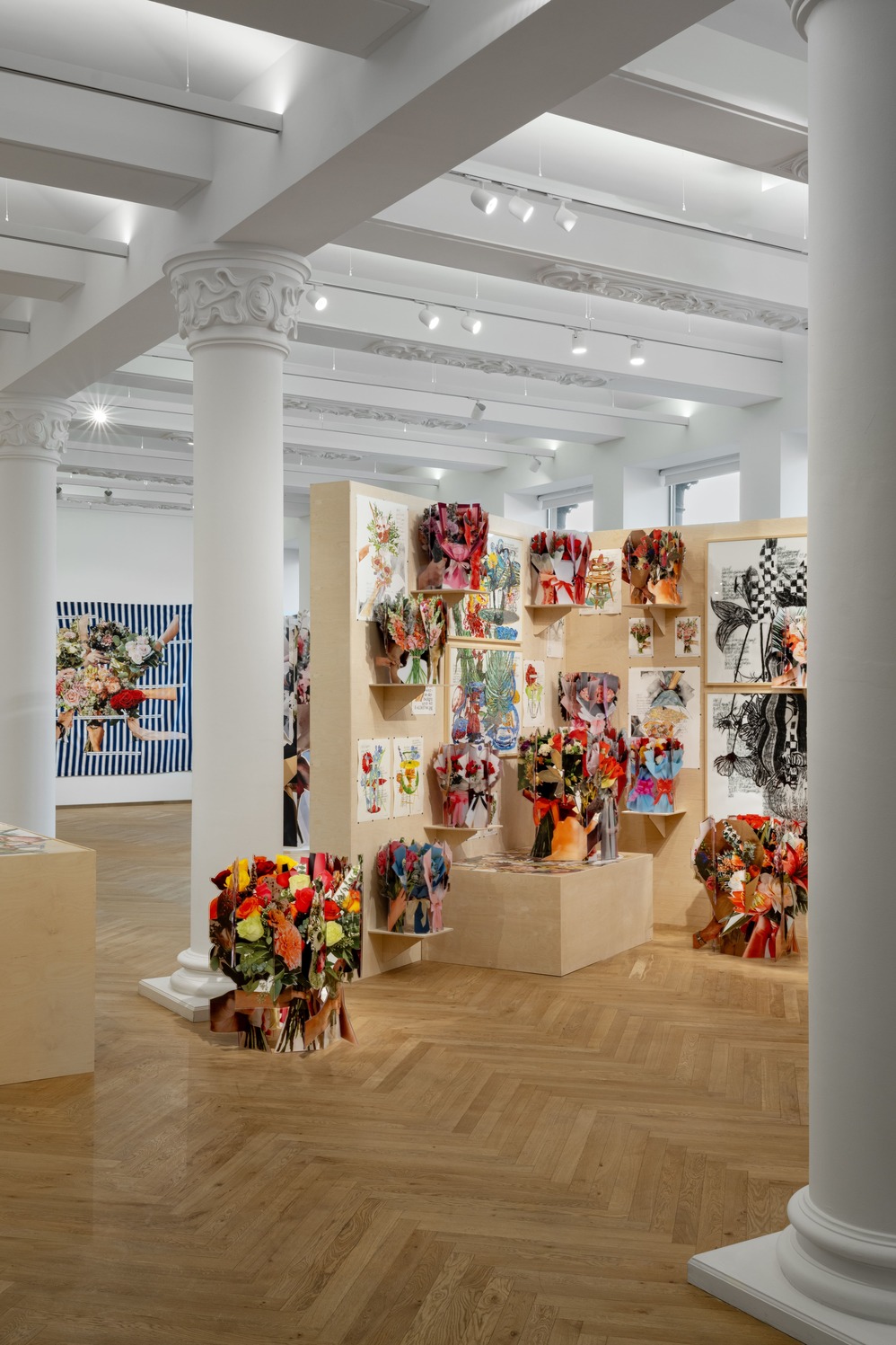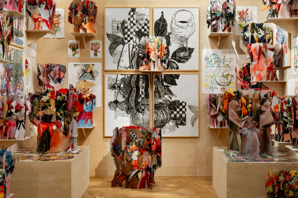 «Все работы Дмитрий создал специально для Limé и выставки “Цветы.Превращение”. Это site-specific проект, созданный для локации Gallery и вдохновленный ее архитектурой», — говорит команда Sample. И поясняет, что «сценография» проекта в виде цветочного магазина — тоже идея Кавки. «Пространство Limé Gallery дало толчок для масштабирования и детализации замысла — так появились импровизированные киоск и холодильник с “букетами”. А вместе с командой Limé мы уже зациклили процесс “превращений”, добавив в экспозицию настоящий цветочный поп-ап-магазин». Он заработает c 6 по 8 марта. Здесь можно будет приобрести букеты тюльпанов-пэрротов. Вместо упаковочной бумаги — авторская графика Дмитрия Кавки. На каждом экземпляре — уникальный порядковый номер и подпись художника.