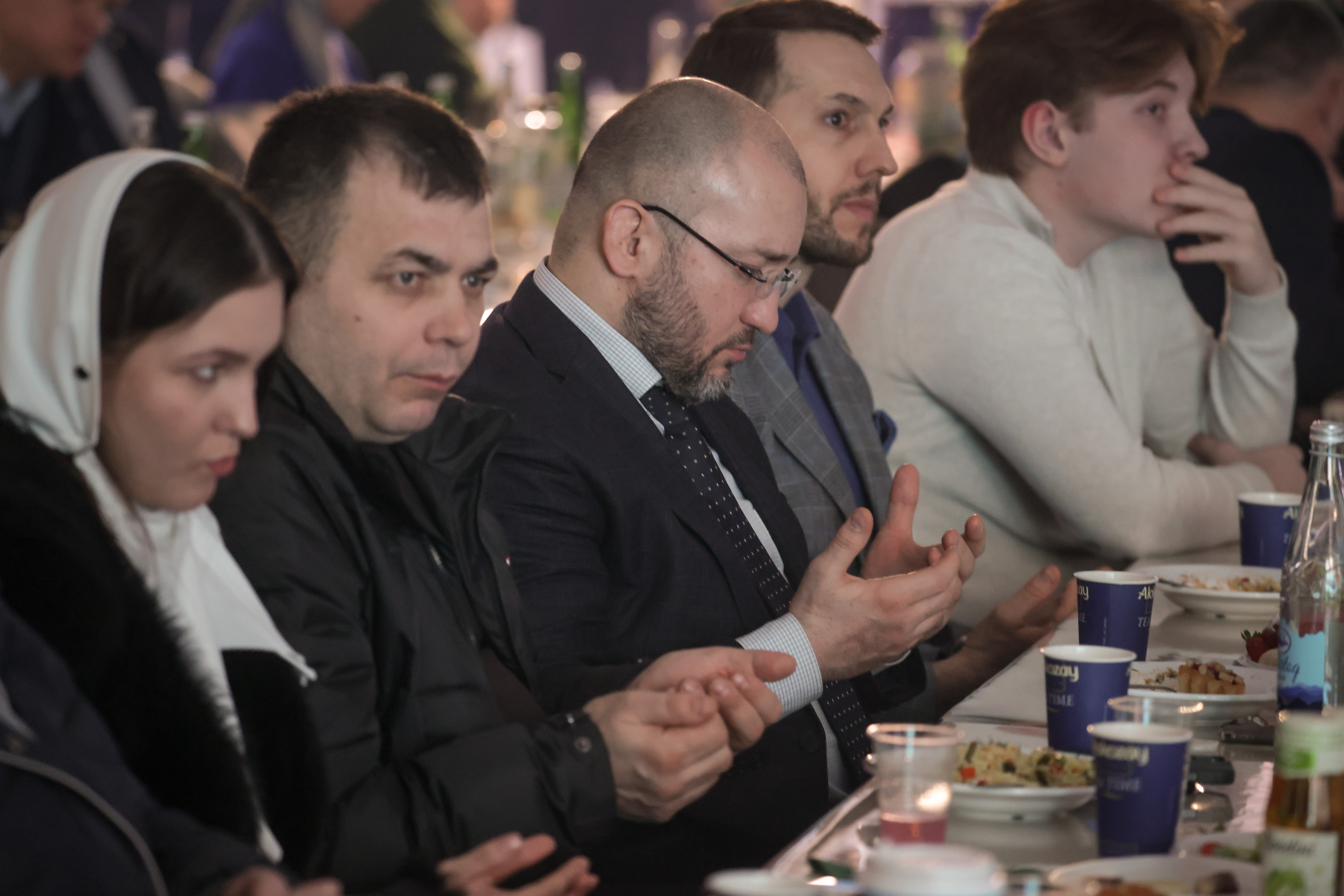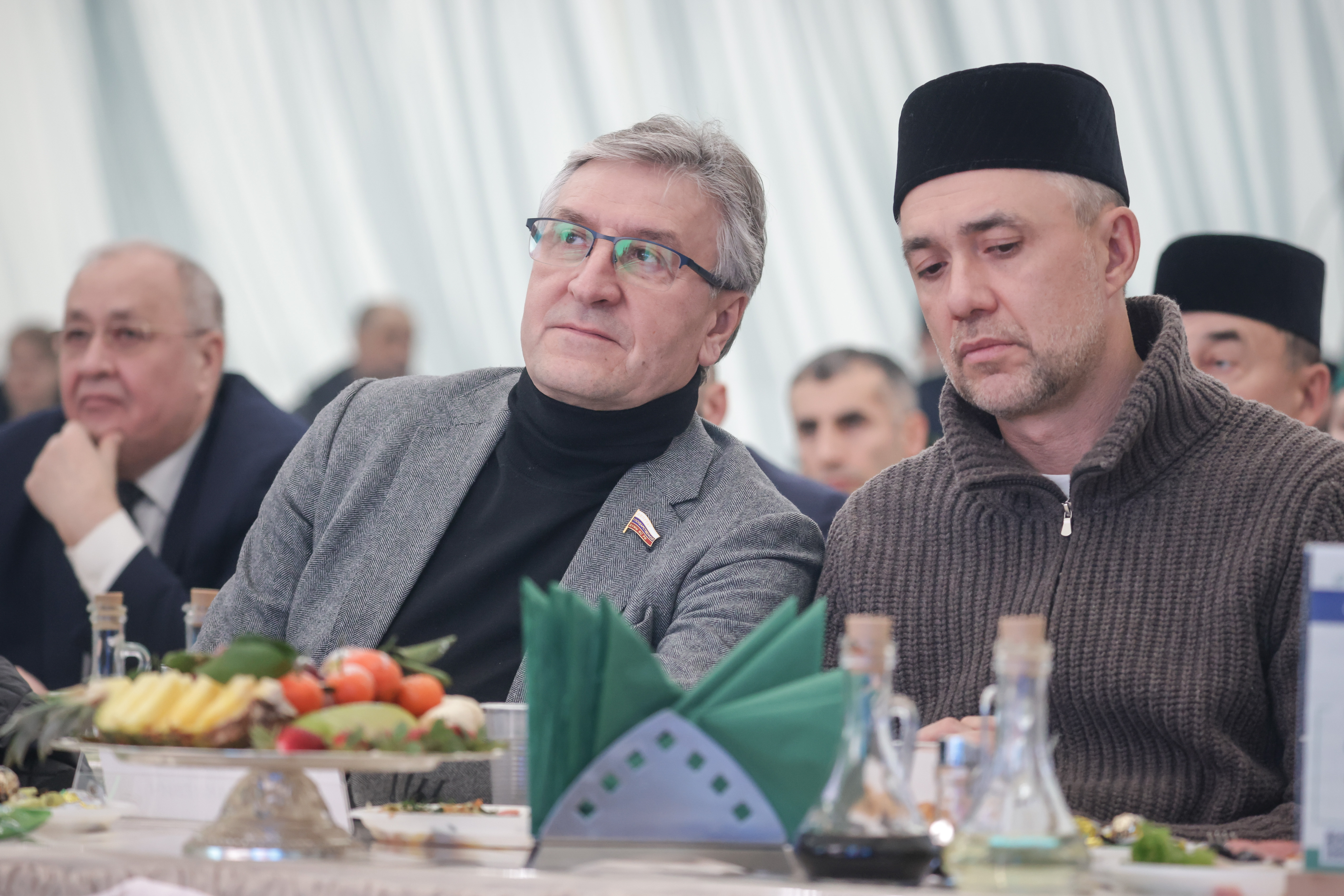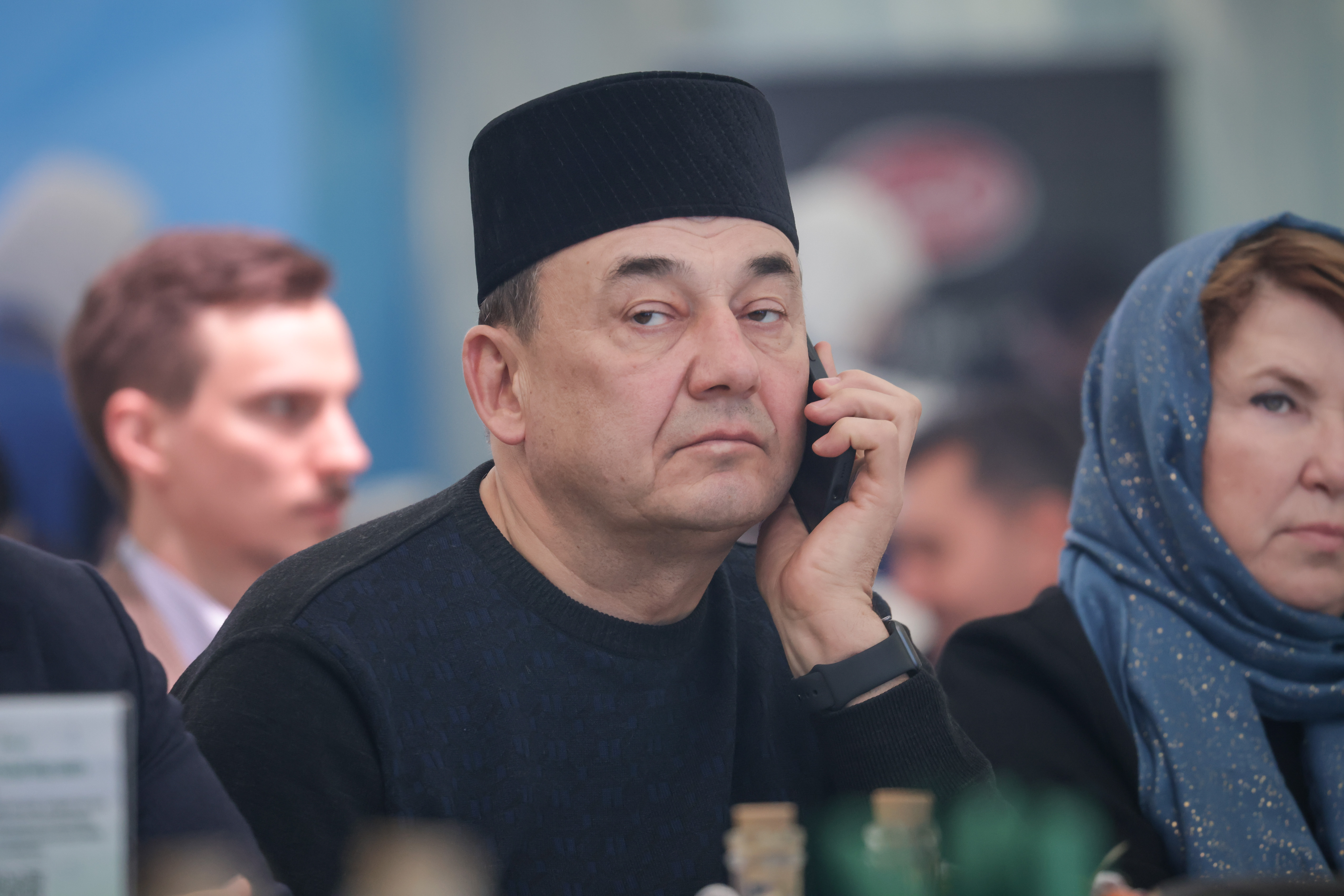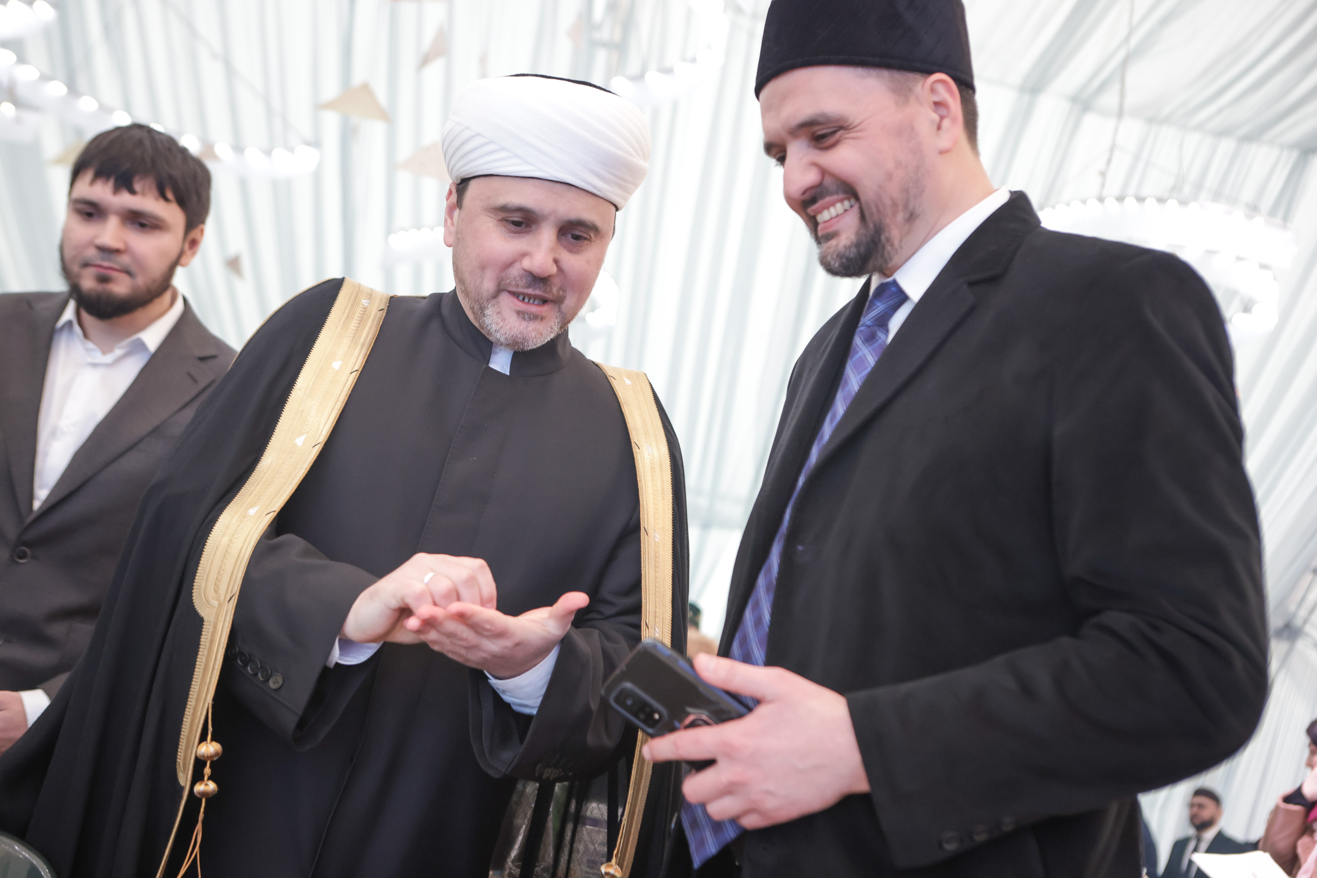 Муфтий Москвы Ильдар Аляутдинов в этот день приветствовал всех с экрана из Медины. Зато в зале был его старший брат — популярный проповедник Шамиль Аляутдинов, одетый в элегантный серый пиджак.